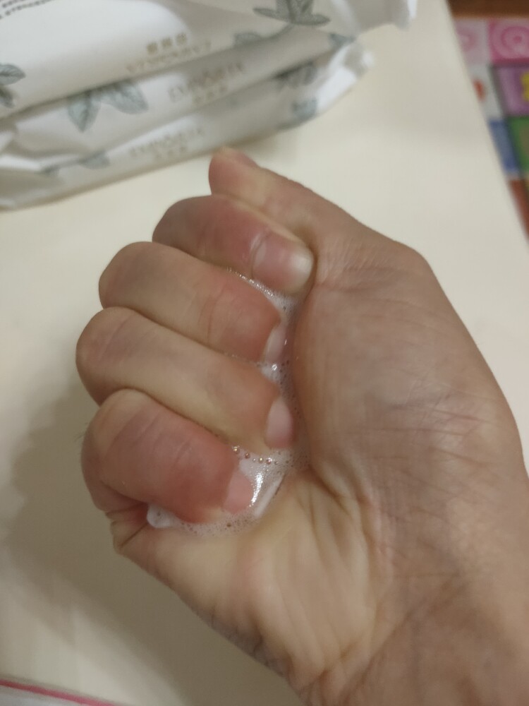 我拿了一张新的湿厕纸,然后我握在手里,可以看出它的水。不是很湿正好这个,如果再多的话就擦的不舒服了。