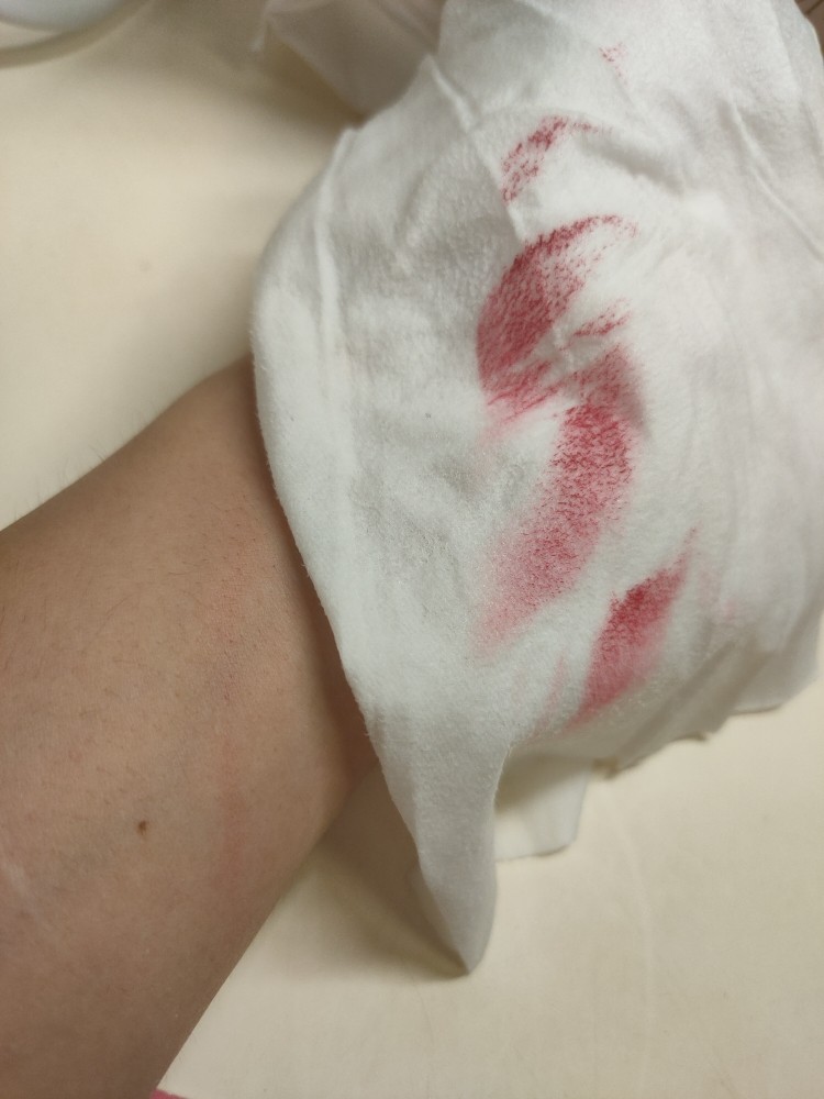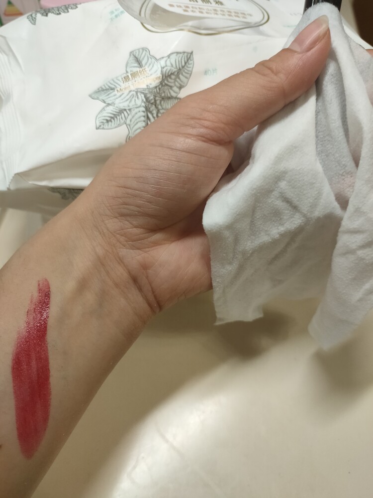 我抽出了一张,准备用口红试一下看看能不能擦掉。如果口红都能擦掉。那擦屁屁肯定没问题。