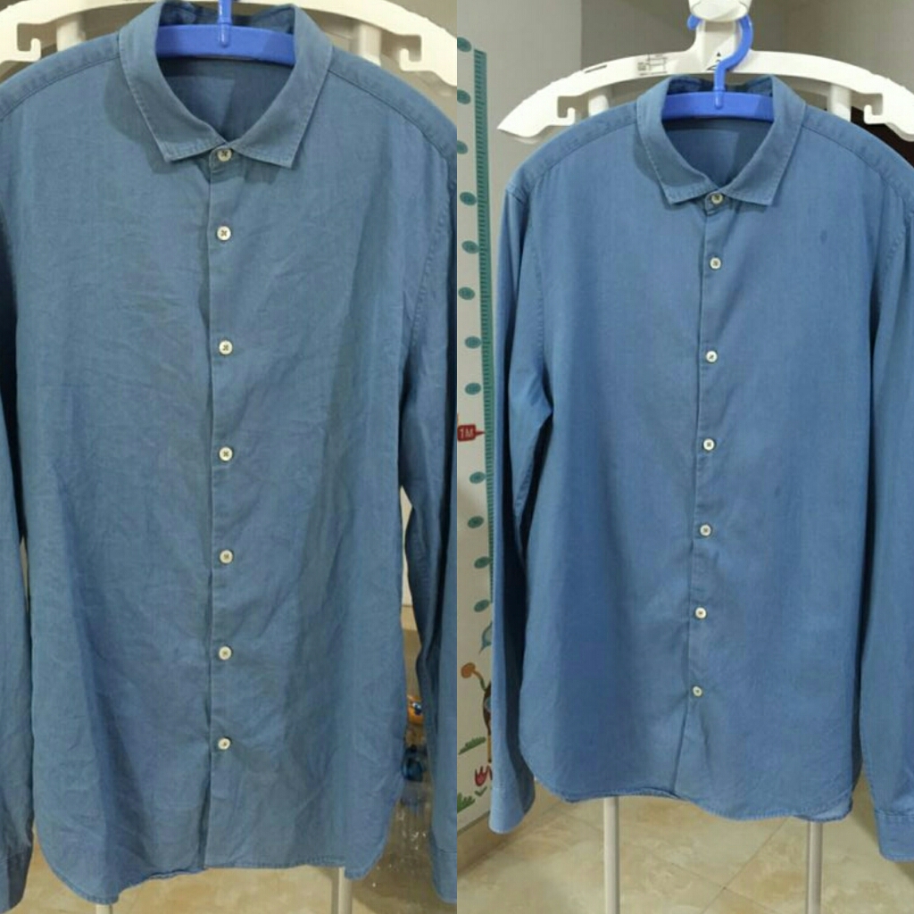 男士全棉牛仔衬衫,效果很好,熨烫速度也快。熨烫下摆还是有难度的,离手太紧会被蒸汽烫到,这是挂烫机通病,需要借助工具,拿个板什么的。