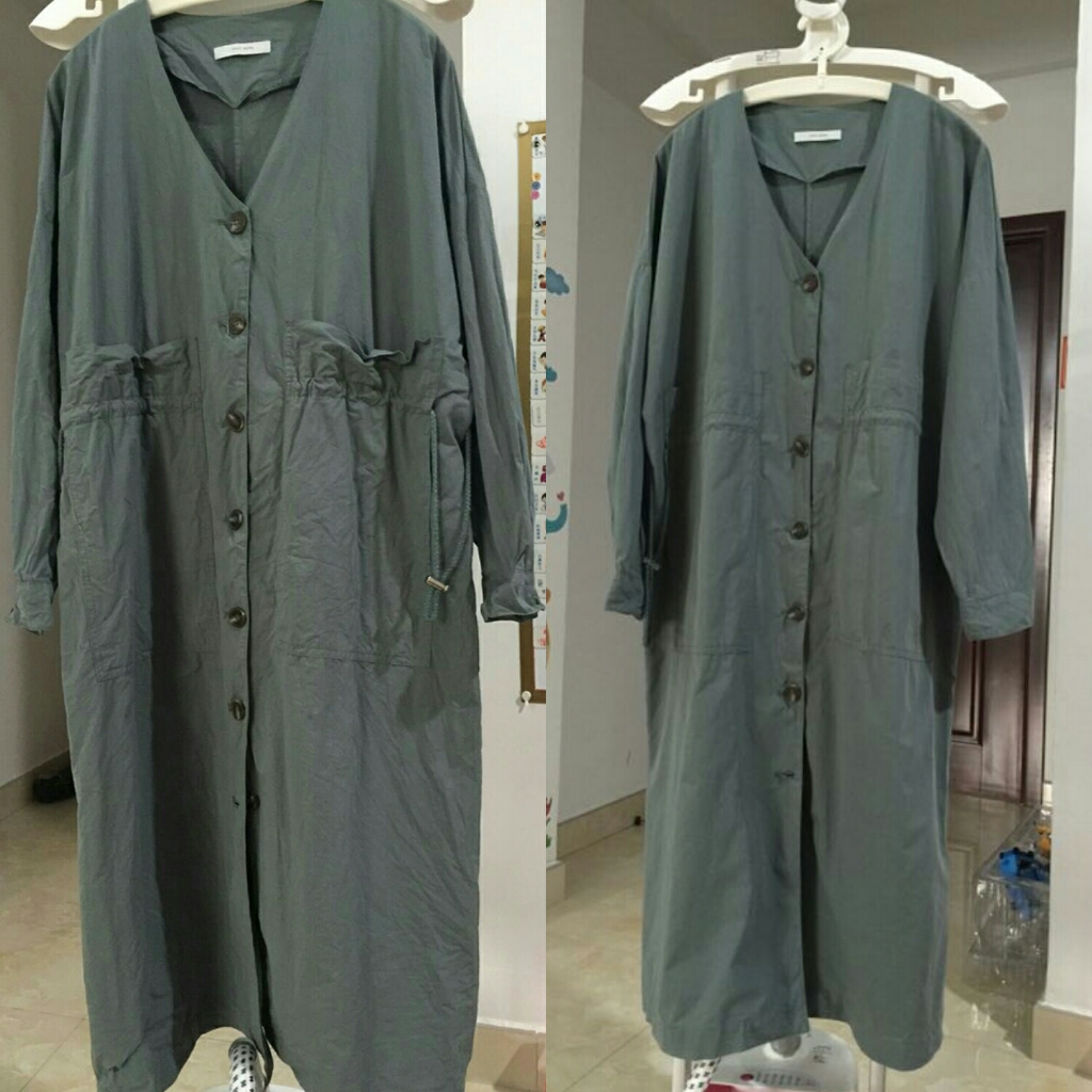 女士长款风衣连衣裙,面料有些硬挺的,效果对比看图,做不到和平的熨斗熨得那么服帖,已经不错。