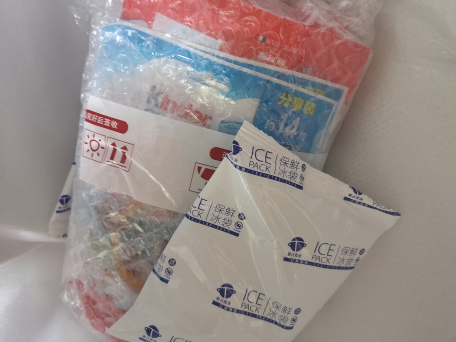 最近天气炎热,拆开来后可以看到两个冰袋,已经融化了。巧克力有点软,放冰箱就好啦。