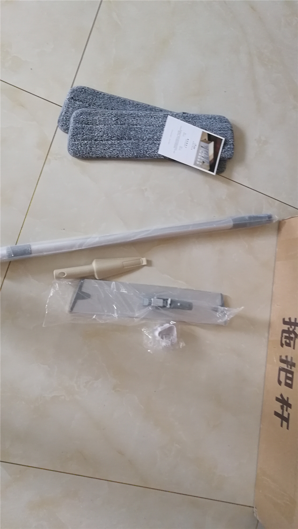 最后这是全部安装完的效果 拖把杆可以自由伸缩旋转 拖把头整体是有点梯形 特别是针对边角很方便 试了一下100平米 基本上15分钟搞定 真的很轻松