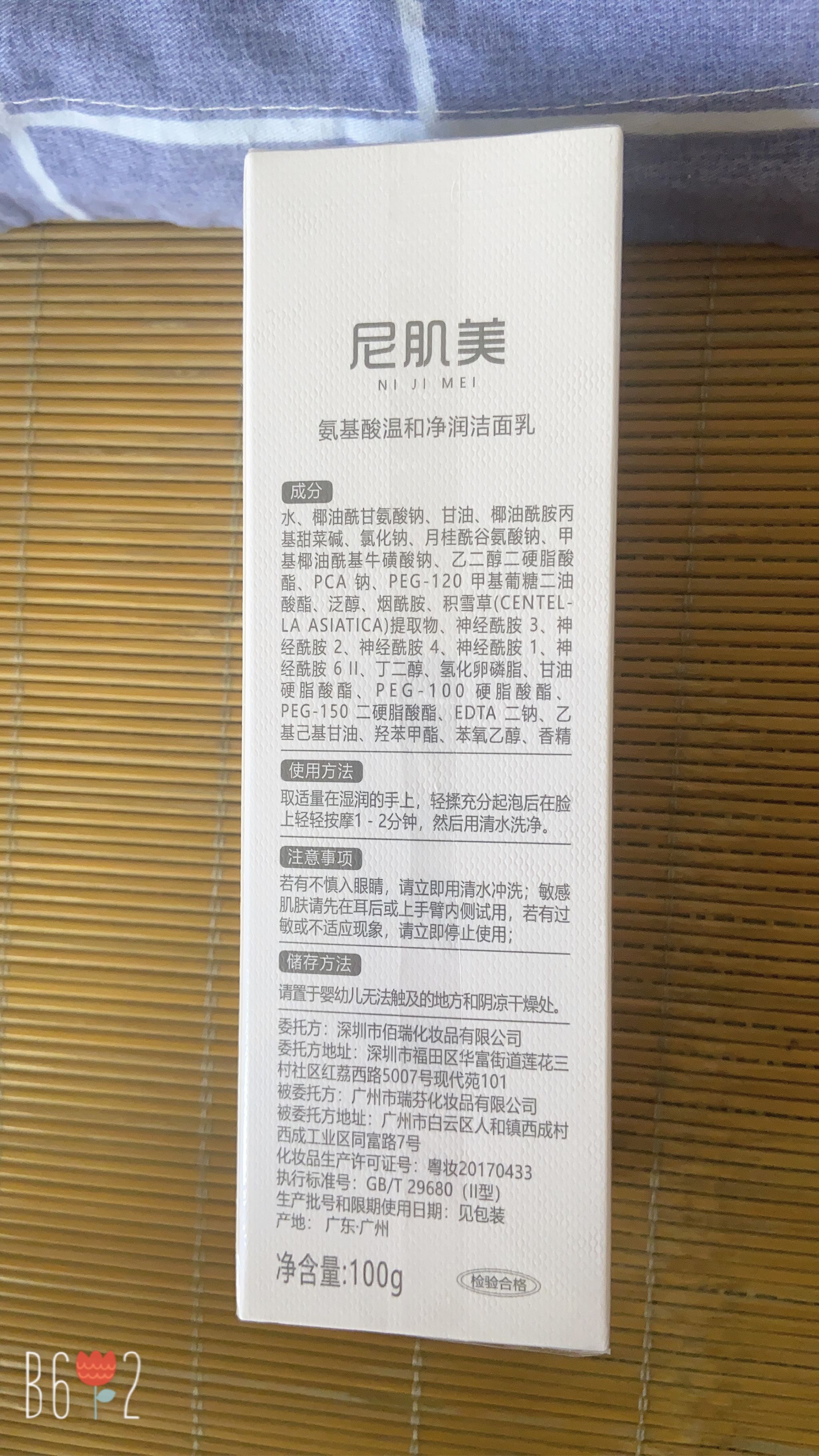 尼肌美氨基酸温和净润洁面乳 盒子上面有详细的配方,成分,使用方法。盒子表面干净整洁。