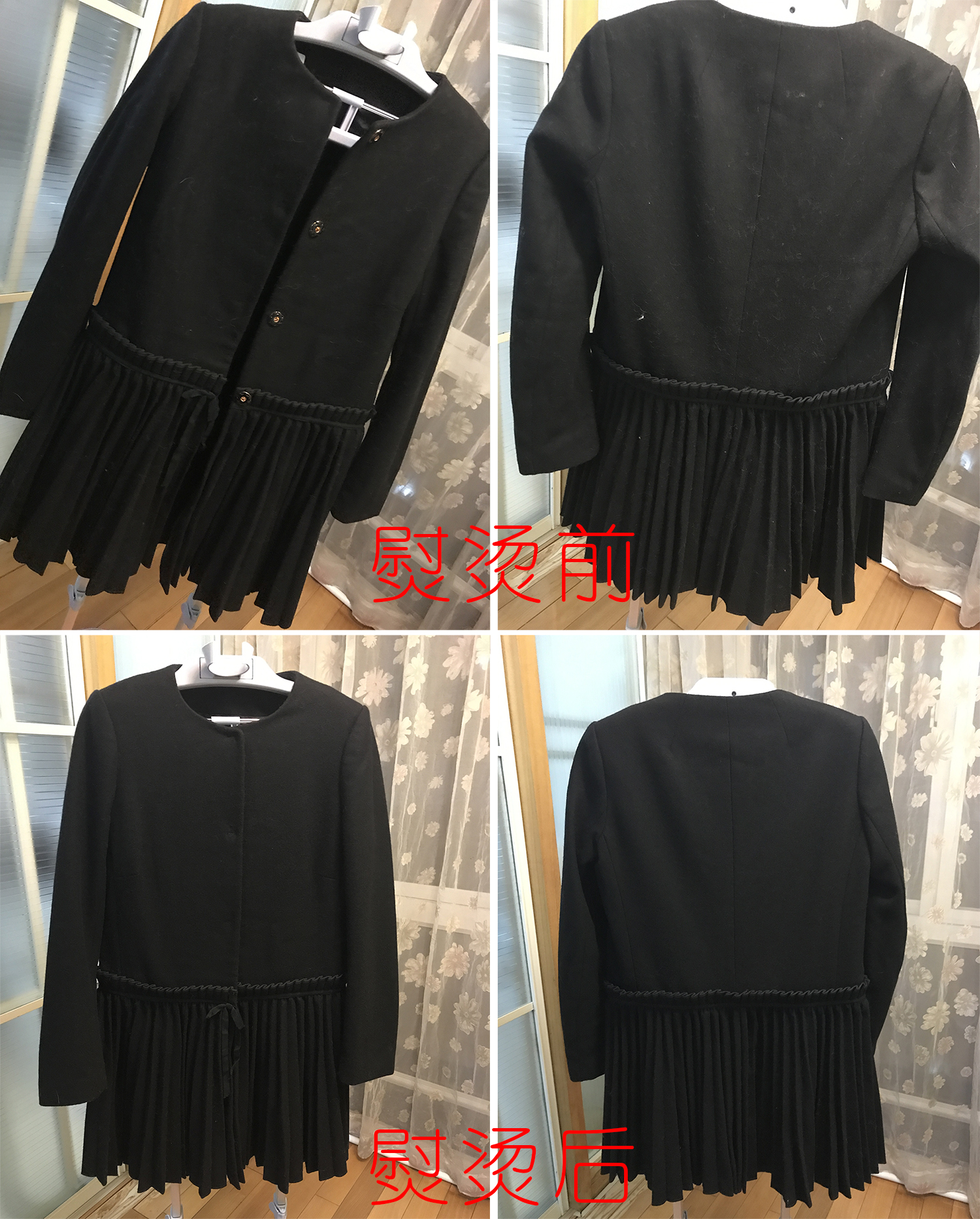 这件是用挂烫的,稍微熨烫几下小褶皱和压痕就会平整,对于比较重的褶皱可以开强力档熨烫,多熨几下也能顺利平整。熨烫后效果简直太赞。上对比图,有图有真相!感觉整件衣服都上了几个档次有木有!