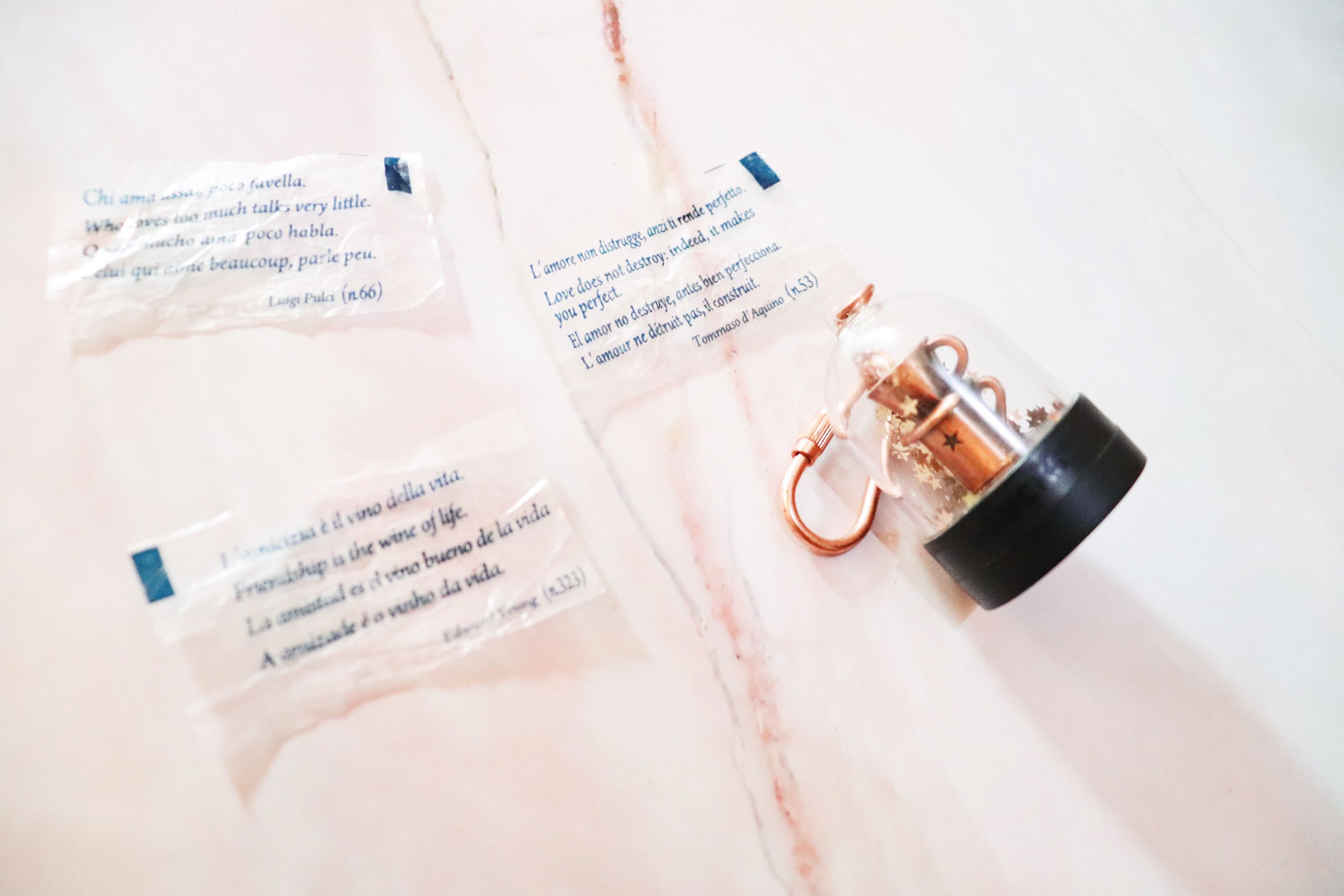 单颗巧克力由彩色锡纸独立包装,方便卫生。 拆开锡纸,里面还有一层写着情话或诗句的纸条,作为糖纸控和手帐爱好者,特别喜欢这种设计,吃完巧克力可以把诗句夹在手帐中,每天一句诗,每天都是独一无二的一天。