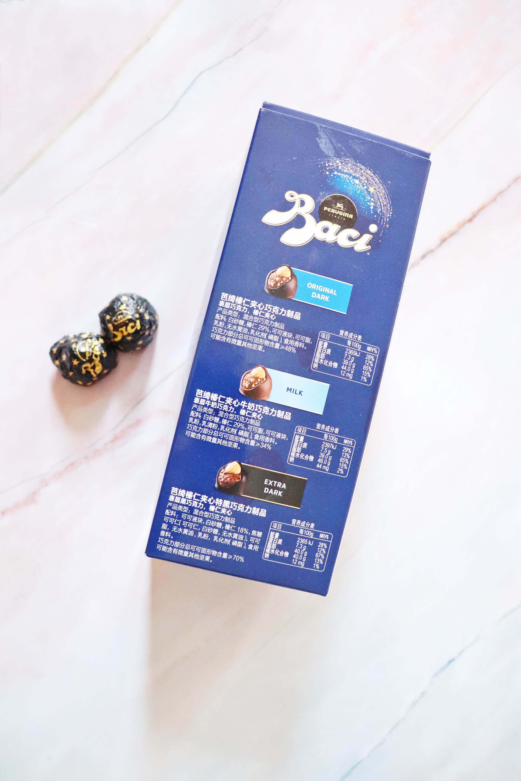 拆开外包装,可以看到三种不同口味的巧克力,一共在35颗左右。三种口味主要是可可和榛仁含量有所不同。