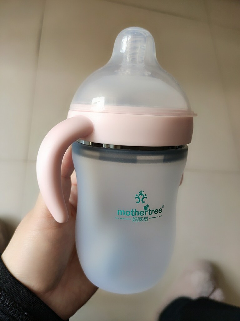 奶瓶的瓶身是硅胶的,软软的,不用担心掉在地上会摔碎。粉红色的把手特别可爱,宝贝以后就可以拿着把手自己喝奶了,这点很方便。因为大宝是男孩,所以一直想生个女孩,刚好是粉粉的,特别合我的心意。奶瓶里的软管也很方便,管子挺粗的,特别好清洗。而且杯口很大,不管是泡奶粉还是喝水都非常好,真的是太喜欢了。