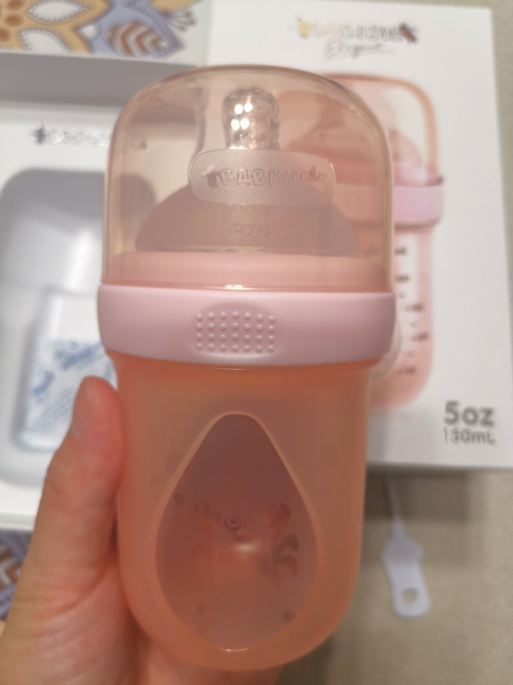 宝贝的包装非常精美,看上去很有档次。实物质量也很好,自用或送礼都是不错的选择。喜欢奶瓶的颜色,实物和图片没有色差,都是粉粉的少女粉。很实用,外出携带也很方便。做工很精细,毫无粗劣感。奶嘴是做的螺旋仿真设计,很适合恋乳的宝宝使用。瓶身的暗花纹设计,给奶瓶整体带来活泼的感觉,很讨喜。瓶身的防烫外壳很好的保护宝宝的使用安全。安全无害的材质让宝宝喝奶无顾虑,让宝妈不担心。