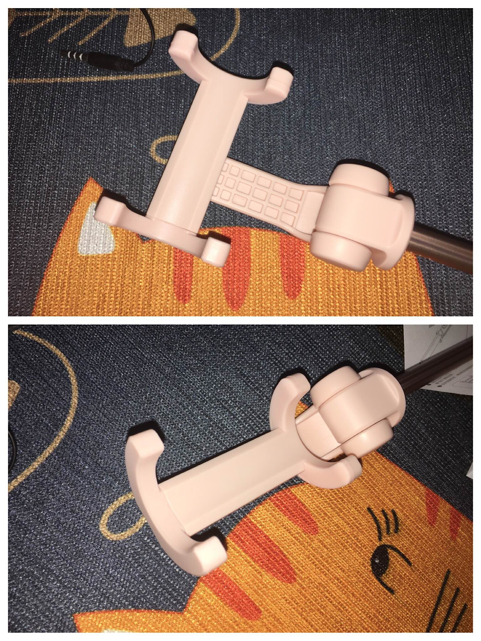 固定手机的旋转设置很好用,而且夹的非常稳,不容易摔手机除非自己把自拍杆掉了,玫瑰金真的挺耐看的,就是硅胶部分黑色纤维容易吸附。