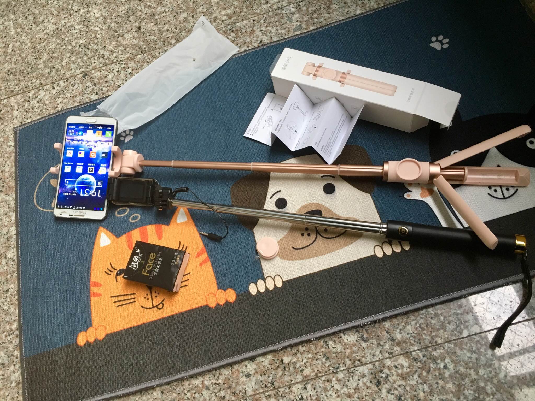 自拍杆的杆材质很好也是玫瑰金的,我那个插线的比这款长度会长一些,用着不方便,只能手上用不能拍远处的自拍。