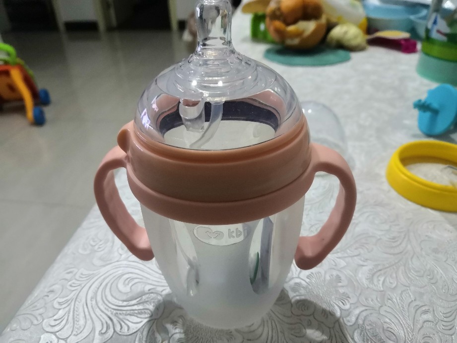 很多的奶瓶都是独立重力吸管和奶嘴,只要打开瓶盖就会自动分离,很容易掉地上。但是KBI重力吸管和奶嘴的吻和接口这个设计比较好,他是软硅胶密封吻合,开盖不会掉落,而且拆洗方便。