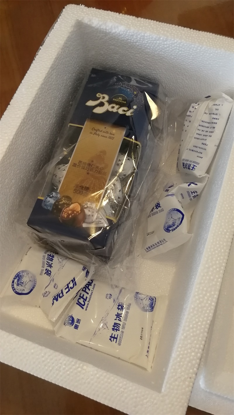 冰袋+泡沫箱的包装,保证了巧克力的完整性,没有因为炎热的天气而融化。