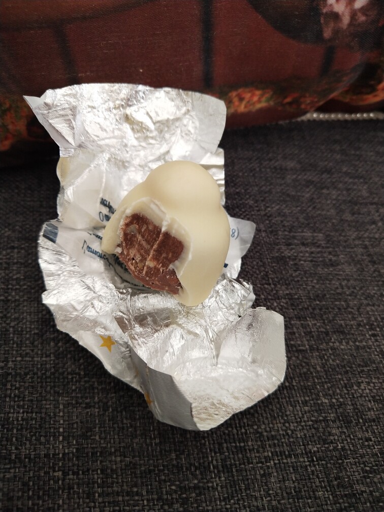 外边一层白巧克力,即便是黑巧克力和榛仁