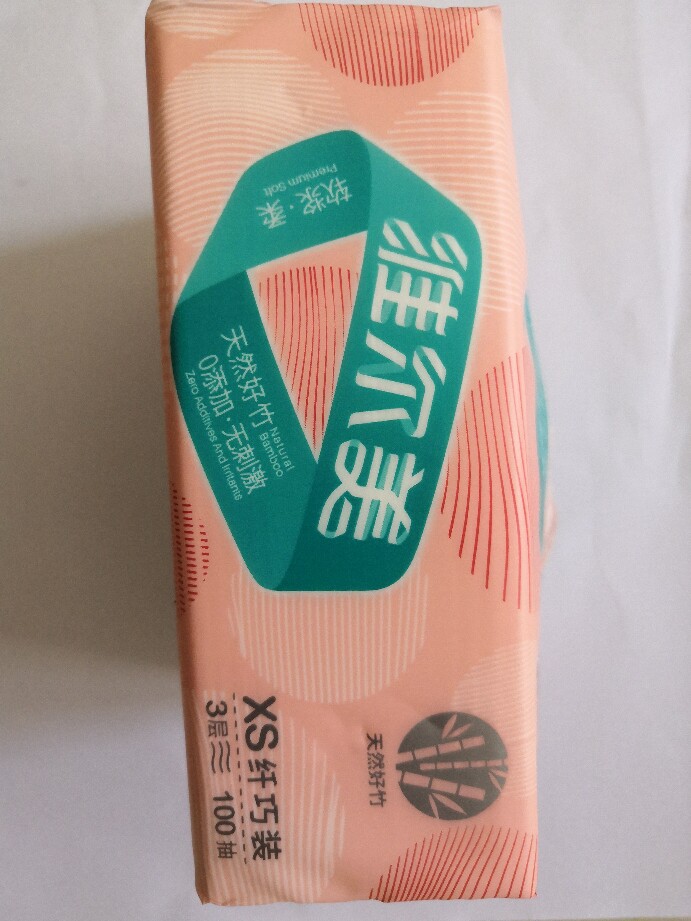 抽纸xs,外包装颜色素雅简洁,正面抽数,背面简介,生产日期也在背面