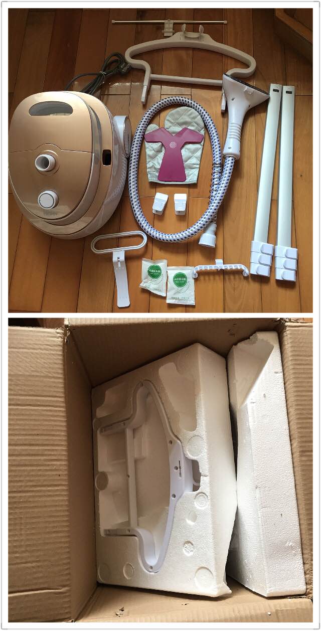 先来一张全家福,东西不多,但是还是很全的,赠送的防烫手套很好用,刚开始用挂烫机的时候不是很熟练,多亏了这个防烫手套,不然手可要烫好多次了。 一开始拆箱子的时候发现少了衣架,找了半天才发现在箱子泡沫的外侧,这样虽然不太好找不过为了保证运输过程中不被弄断还是不错的。