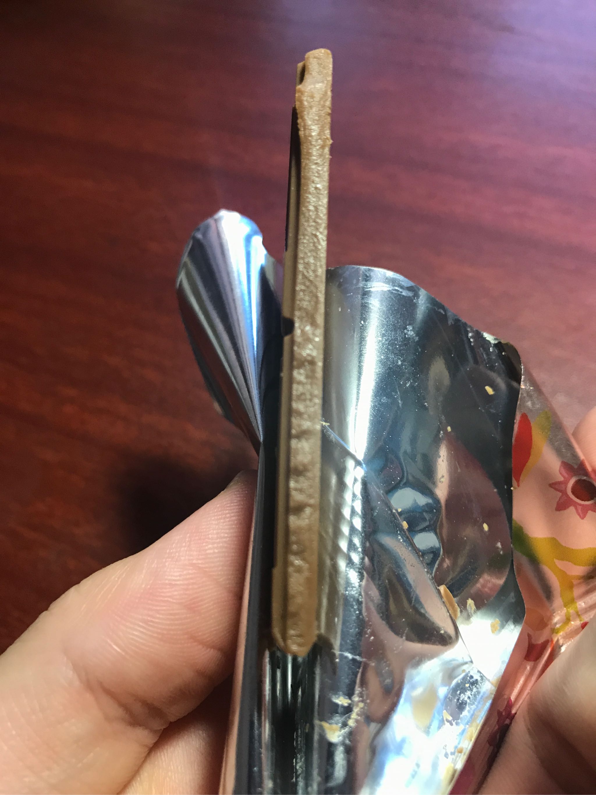 断面没有气泡或碎掉的可可,掰断的声音不是很清脆可能是刚从冰箱里拿出来的原因;不过用牙咬断巧克力的声音还是很清脆的