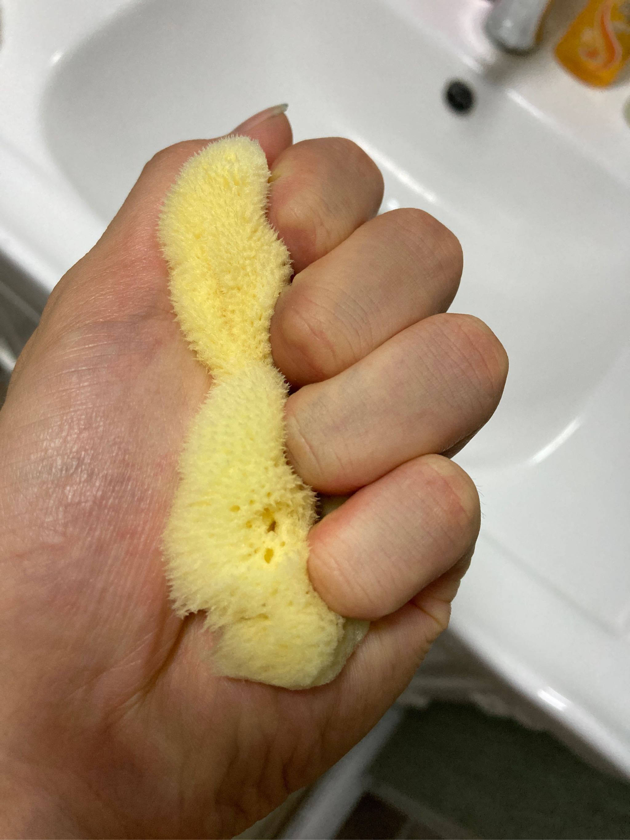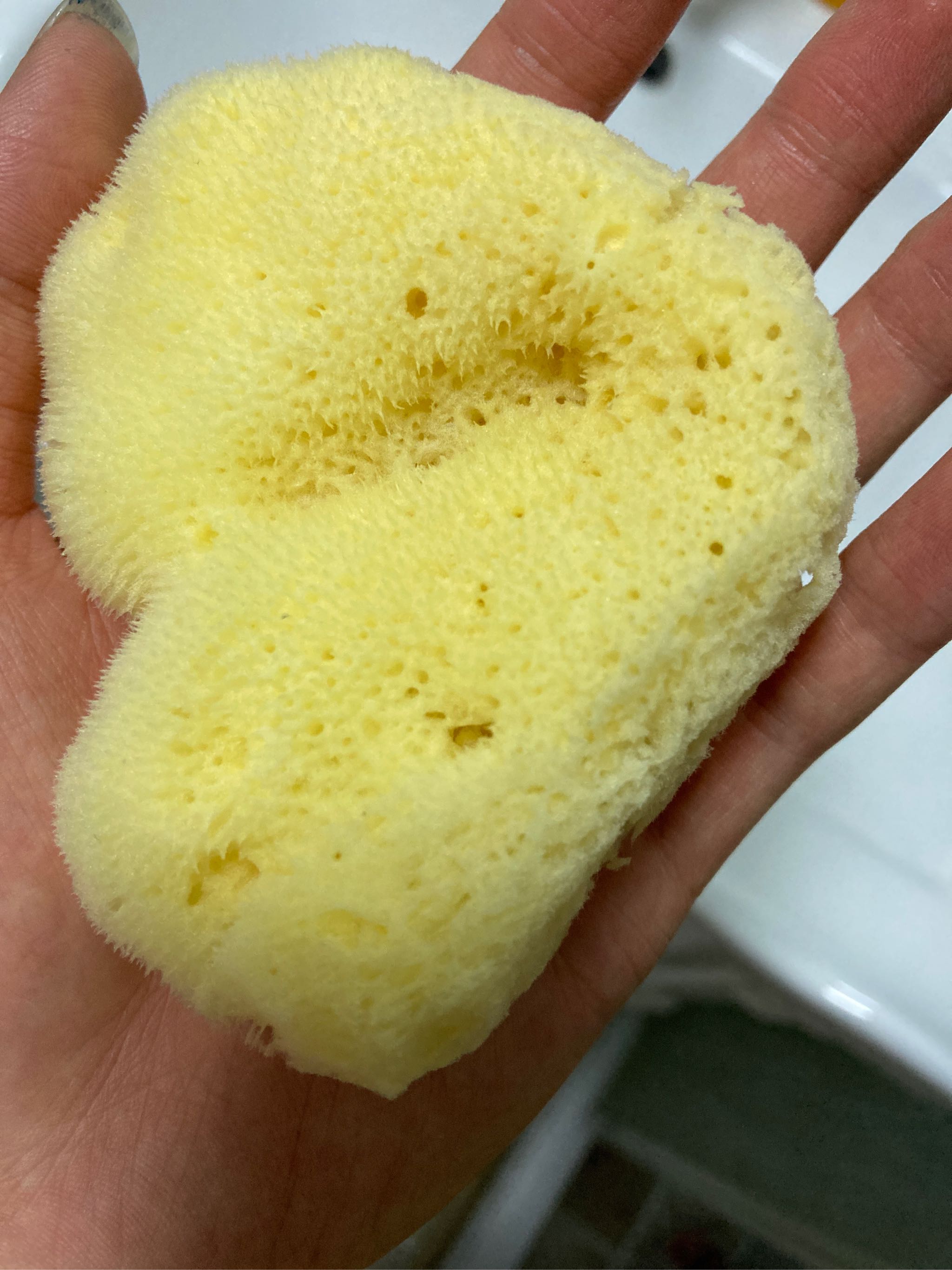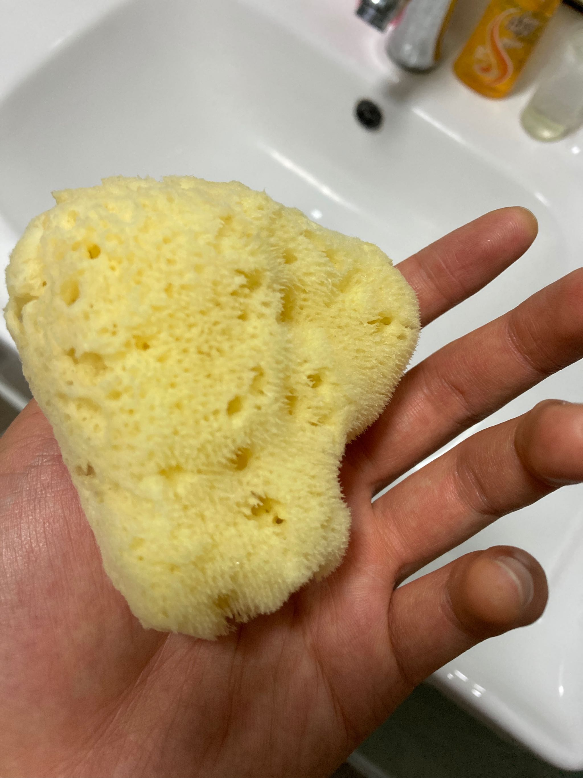 乍看起来像个丝瓜瓢,材质比普通海绵好,就是有点小不好握持,清洗效果不手洗干净,与肌肤接触不显粗糙,还能很好的起泡