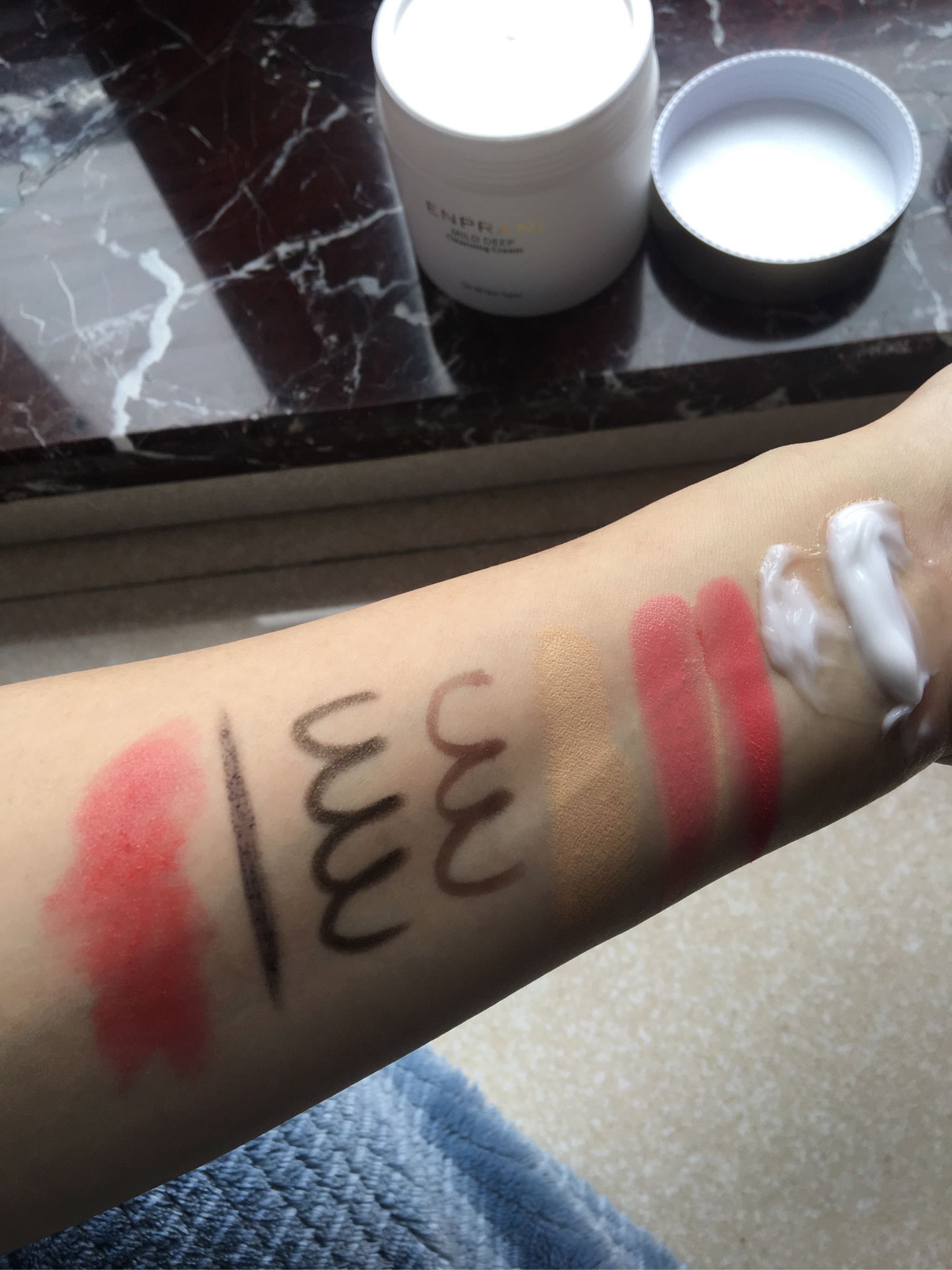 在手臂上,从左到右分别唇膏,眉笔、眼线胶笔,眼线液,粉膏、腮红膏、粉状腮红!然后取适量产品,来试试产品的卸妆能力。其中眼线液和眼线胶笔号称是防脱妆的。