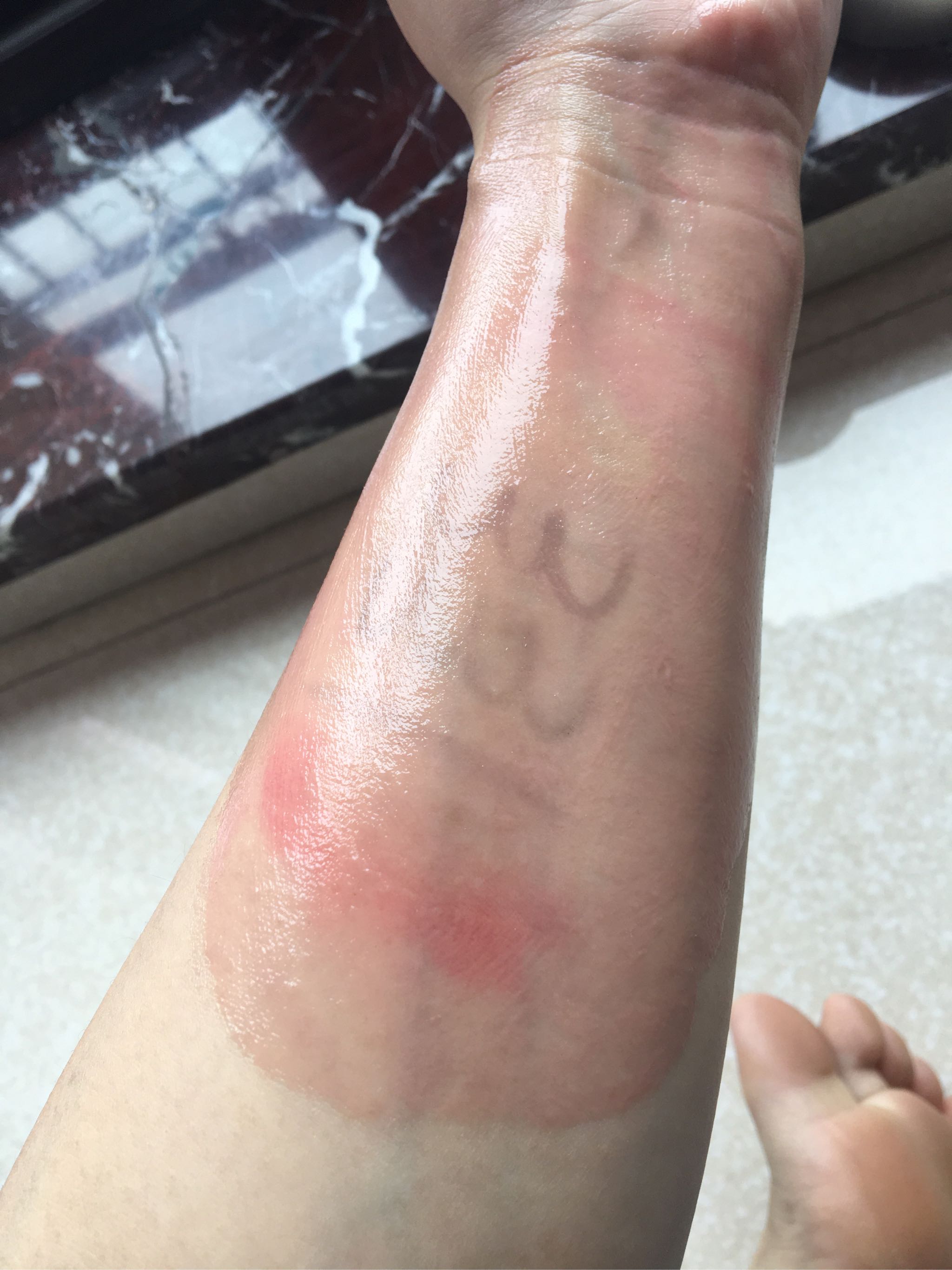 将产品覆盖于涂抹了各类彩妆产品的手臂上。来回按摩,不需要很用力。就按照平常卸妆时候的力道。乍看,还是有点担心卸妆力的。