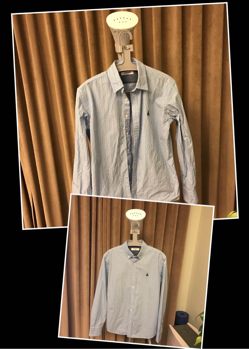 拿了一件男士衬衫开始烫,档位调到棉麻,三下五除二,五分钟不到就烫好啦。先来一张前后对比图。成果还是很满意哒^_^