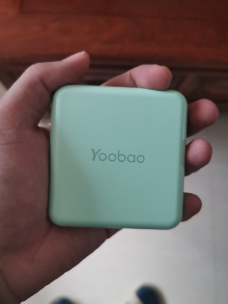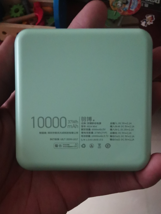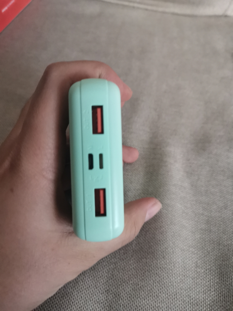 绿色很清新,一只手能正好握住,大小刚好合适便携,两个输出口,两个输入口