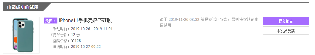 本人?丝小工人一枚,平时很喜欢数码。自从发现淘宝有试用这个栏目,每天都要进去看看有没有自己喜欢的产品,有喜欢的顺手就申请下。这天坐厂交通车上班途中,又点进了试用栏目,突然看到个iPhone11手机壳液态硅胶,觉得很好奇,说实在的用了这么多年的手机,也用很多年的保护套,还没看到过液态硅胶保护套,于是就点进去想看看是什么东东,结果点进去,习惯性的就点了申请试用,点了后才发觉,我只是想看看产品,不是要申请,顿时整个人都不好了,只好安慰自己,我一年数百次的申请,也只不过成功一到两次,这次应该不会那么好的运气就中了吧。结果几天后,一个申请成功的信息到了,点进去一看,我去,居然真的中了iPhone11手机壳液态硅胶,顿时一脸的懵逼,真是怕什么来什么,我没有iPhone11手机,这个试用报告要我怎么写呢。本来想不要这次试用申请,但淘宝规定,申请成功不提交报告,将会失去以后的申请资格。思来想去第二天还是怀着复杂的心情点了发货。于是就有了下面这篇试用报告。