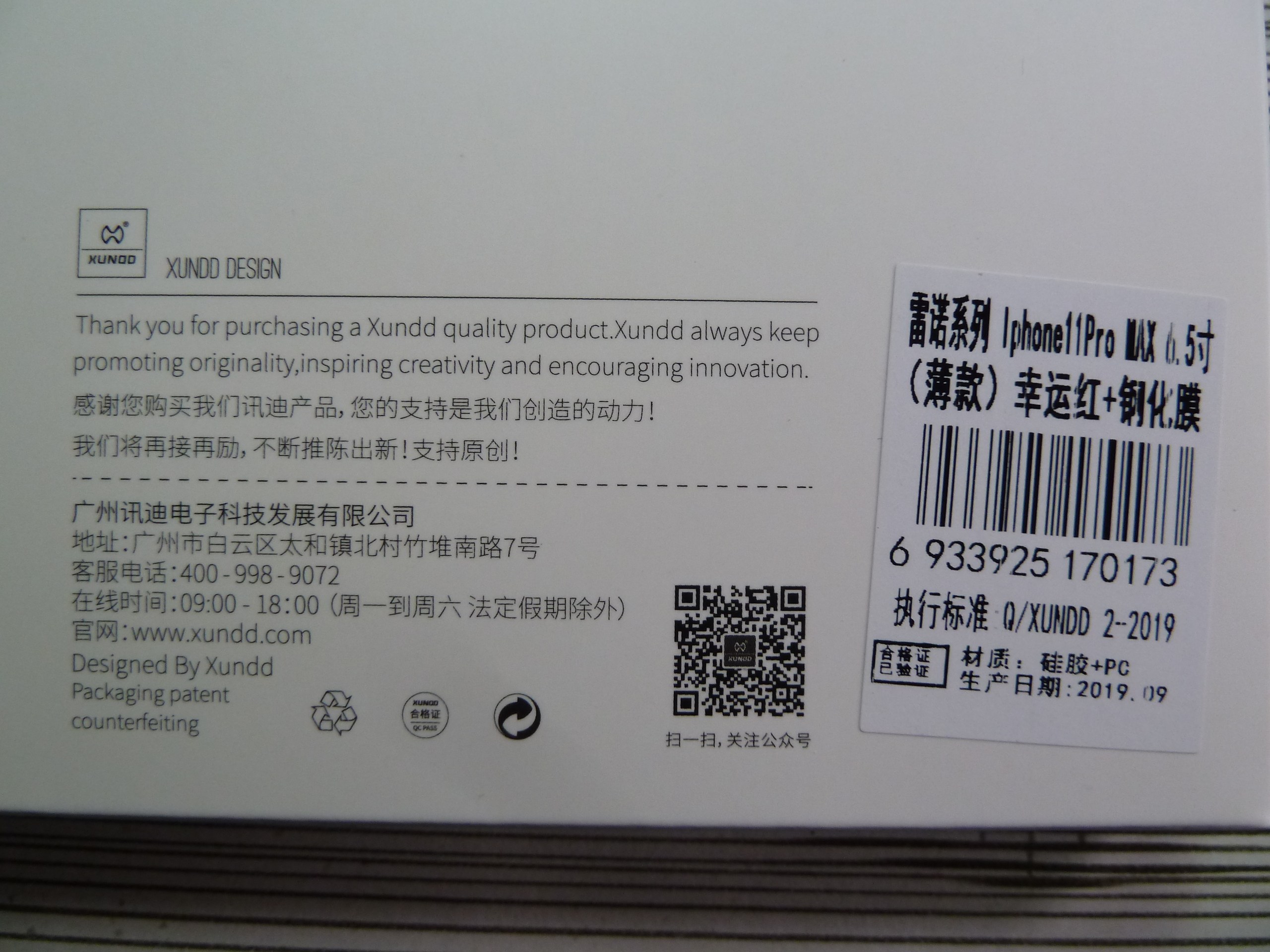 包装背面有产品的各种信息。包括支持的手机型号,保护套颜色,附送的钢化膜,身缠日期,厂家地址,客服电话,网址。该有的都有,显得很正规。