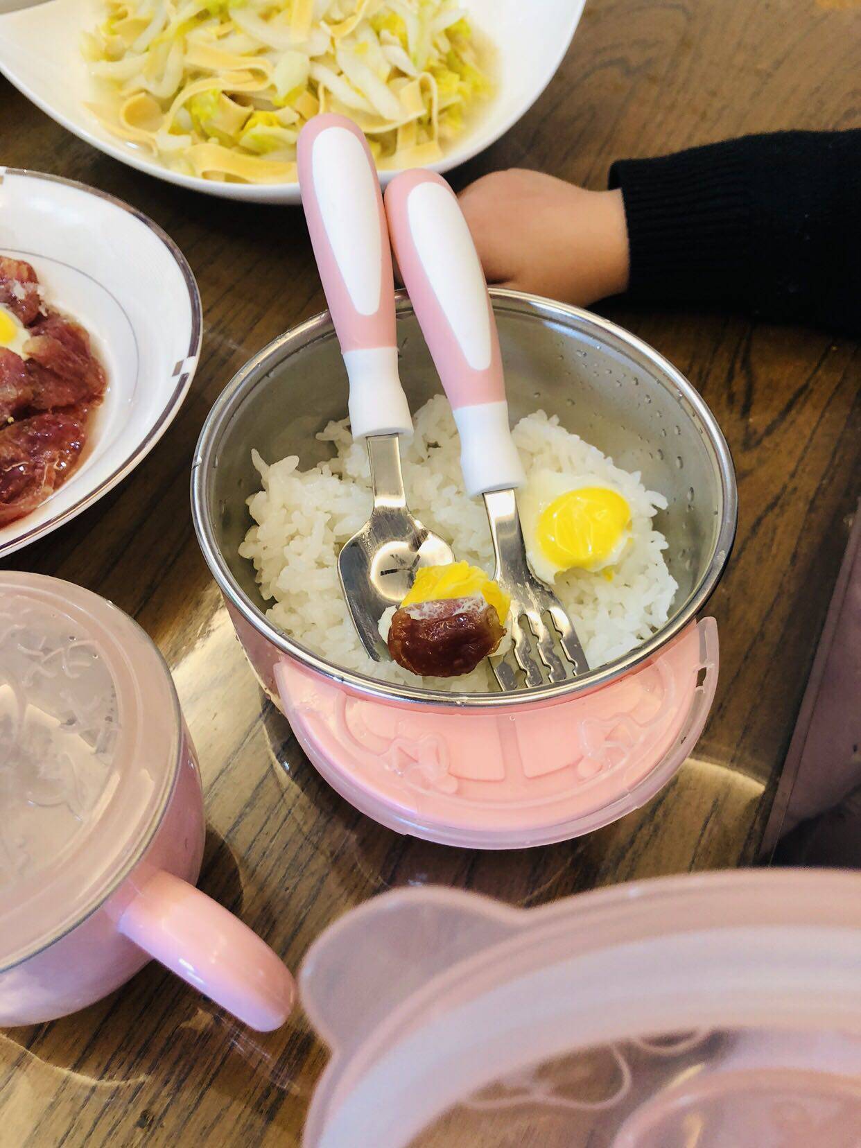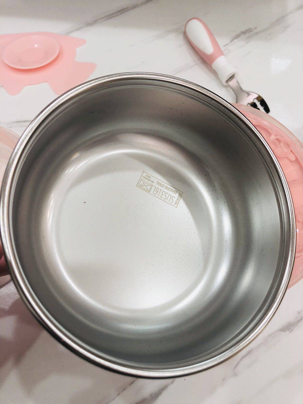 优点:大小碗,叉子勺子,杯子,很齐全。一套就足够了。内胆都是不锈钢的,安全好清洗。其中大碗是可以加水保温的,冬天还是不错的。带的吸盘吸力强,小宝宝也可以使用。总的来说,还是不错的一套餐具。