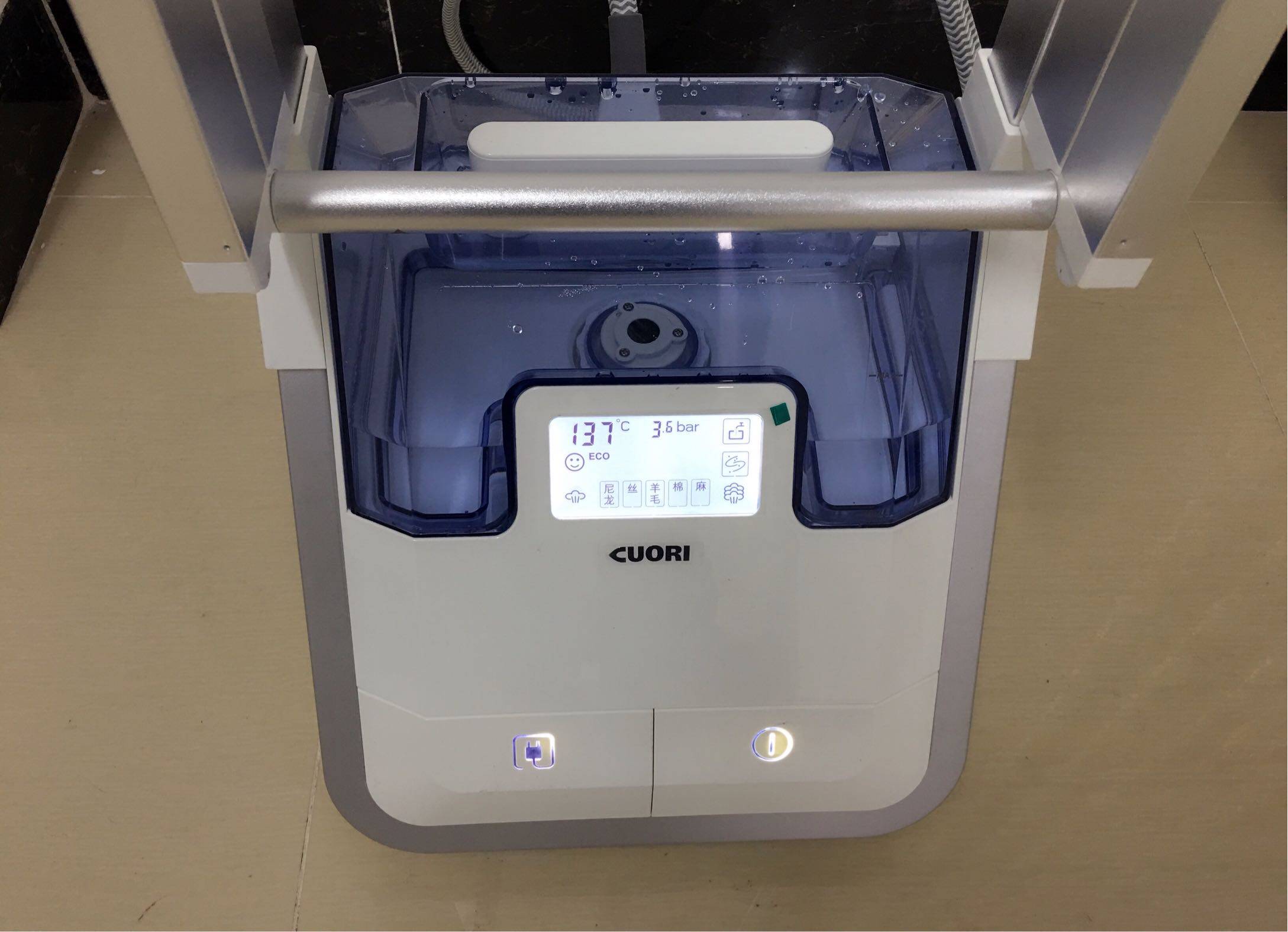 宝贝采用的ECO智能模式,开机就能使用,蒸汽自动调节,不用再思考什么衣服什么料该用什么温度了,真心适合像我这种不爱思考的懒人。当然,如果想要自己掌控温度,也可以通过手柄上的进行换挡。宝贝还能智能监测箱体水量,当箱体水量少于警戒线,显示屏自动提醒加水。ps:宝贝采用的是高亮背光LED显示屏,屏幕很亮,不用弯腰,站着也能轻松看到熨烫数据。