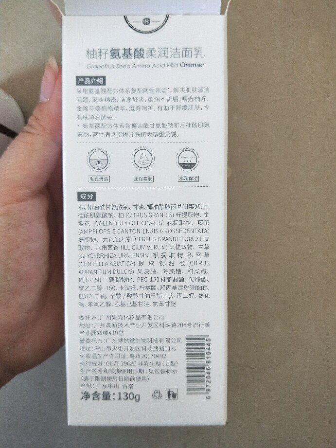 包装简洁,日期新鲜,包装为130g,可以用很久了! 很淡很淡的水果味道,十分清新那种,闻着很舒适! 清洁力很强大!适合油皮!