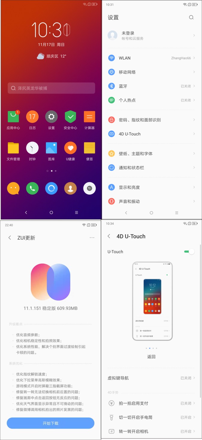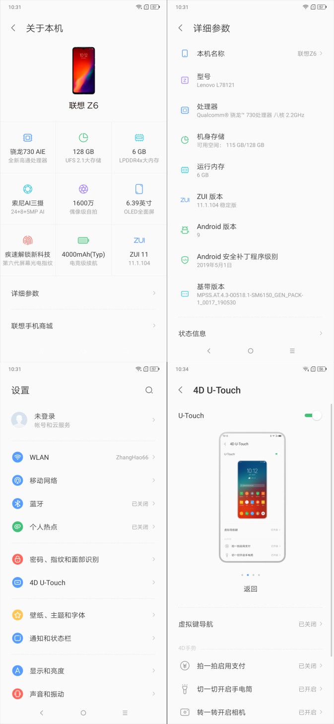 手机的画质很是清晰,分辨率特别的高,19.5:5的屏幕比例,93.1%的高屏占比。系统采用联想研发的ZUI系统,跟安卓系统差不多的使用方法。开启4D U-Touch的模式,可以自由切换各种场景,虚拟键盘。整体来说,操作特别简单。