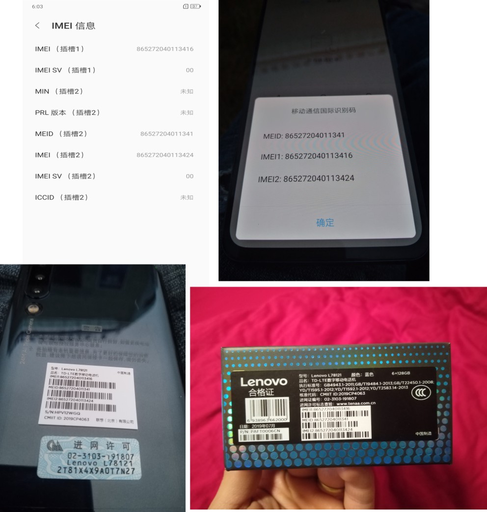 四证合一,验证“真机”。 一、在手机设置里面,找到IMEI信息。二、在拨号界面,输入“*#06#”,查询(国际移动设备)手机串码的操作 IMEI 码。三、新手机的背面,出厂时贴出的 IMEI 码。四、手机盒上面的 IMEI 码。经过验证,四个地方的 IMEI 码,完全一致,是统一的,这就证明了,这部手机,是联想公司的真机。