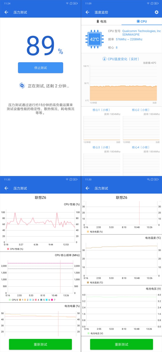 在“安兔兔评测”软件里,打开“压力测试”模式,对手机进行压力测试,手机将进行约15分钟的高负载运算来测试设备性能的稳定性,散热情况,耗电情况等等。结果显示,数据一切正常,CPU性能稳定在60-80%区间,CPU核心频率在2200MHz,CPU 的温度维持在42度,没有发热发烫的热量,丝毫感觉不到。电池温度稳定在35℃左右,电池电压稳定在3.7V左右。一切正常,稳定。电池电量从49%降至43%,不是特别的耗电,完全能满足一天的普通使用的需求。