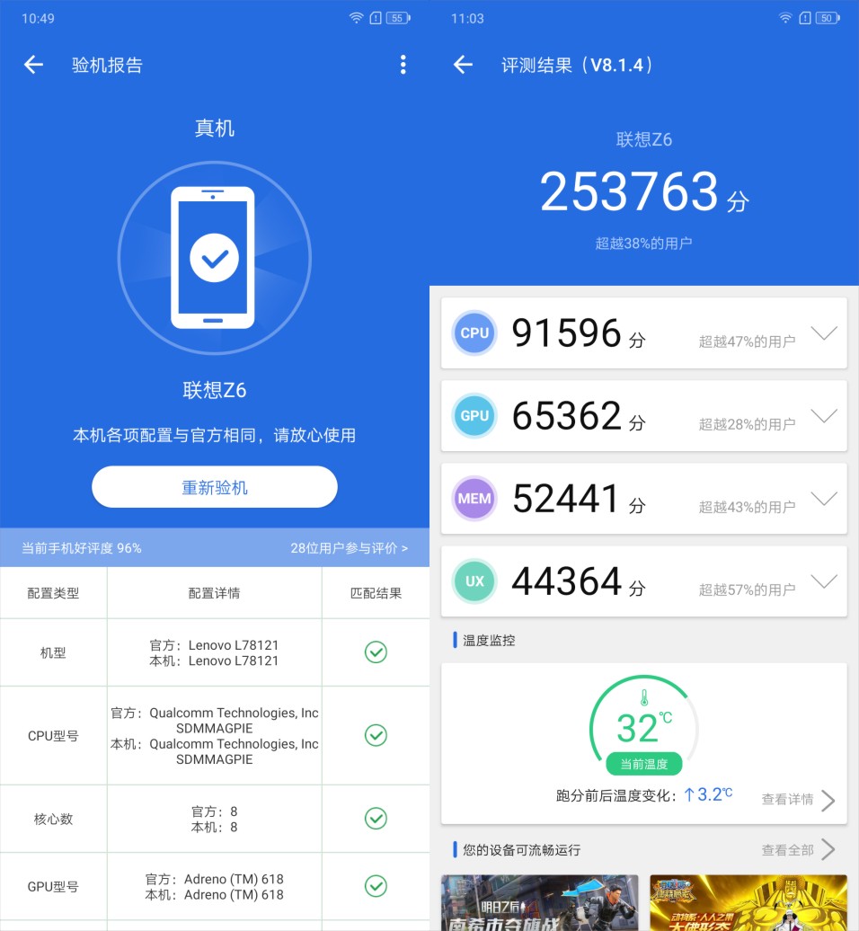 使用手机行业公认的跑分测试软件“安兔兔评测”进行了测试。下载软件后,自动安装,全程在20秒左右完成安装。打开软件,进行真机检测,测试结果为“真机”,本机各项配置与官方数据相同。在首页进行跑分测试。手机播放3D视频,通过3个场景,大约6分钟的测试,得出的跑分为253763分,超过38%的用户,在千元手机里面算是很优秀的了。其中UX处理技术更是超过57%的用户,厉害了。跑分后的温度为32℃,在高强度3D模式下只上升了3.2℃。这个温度,运行起大型游戏,也是不费力气的。