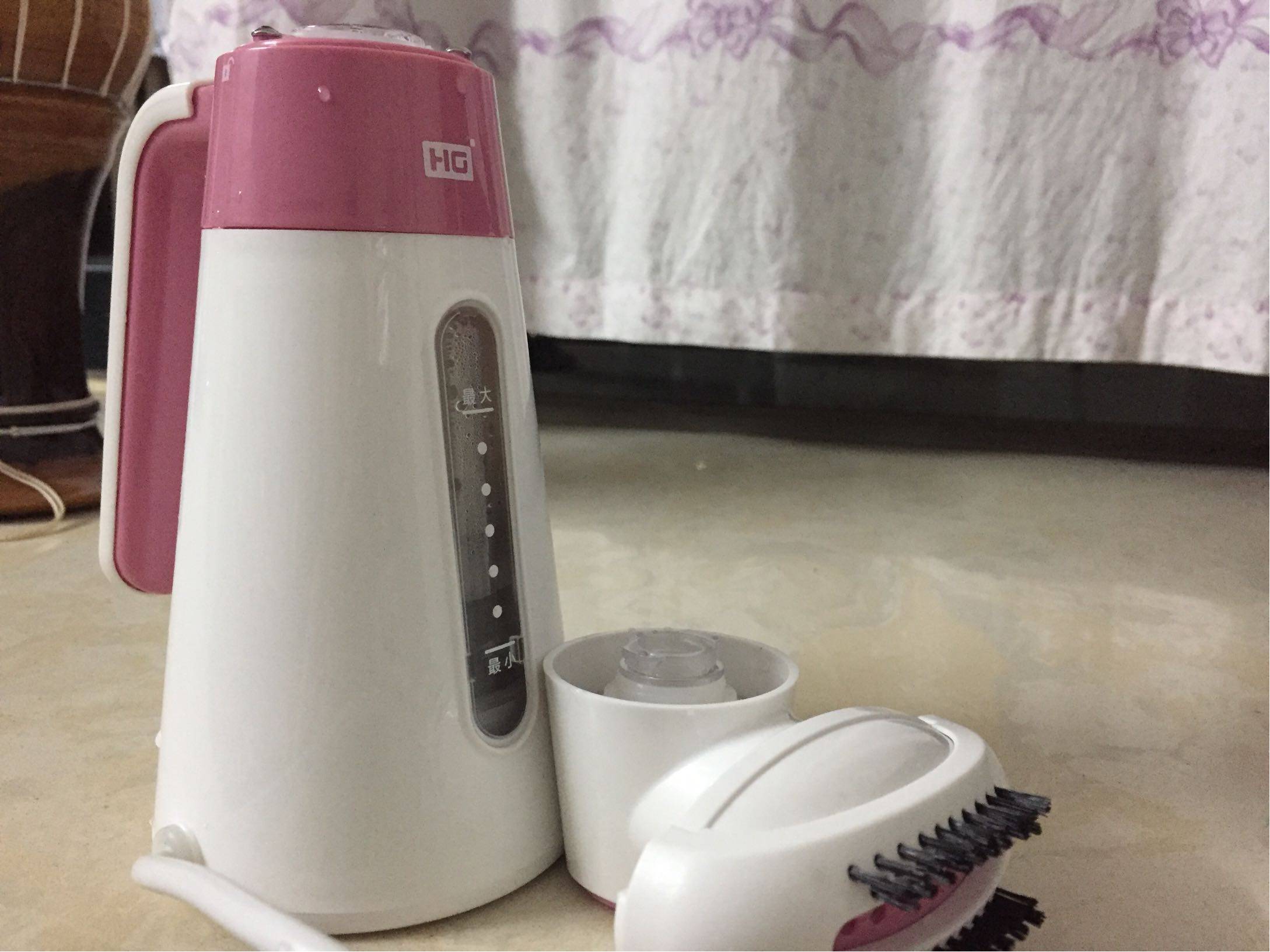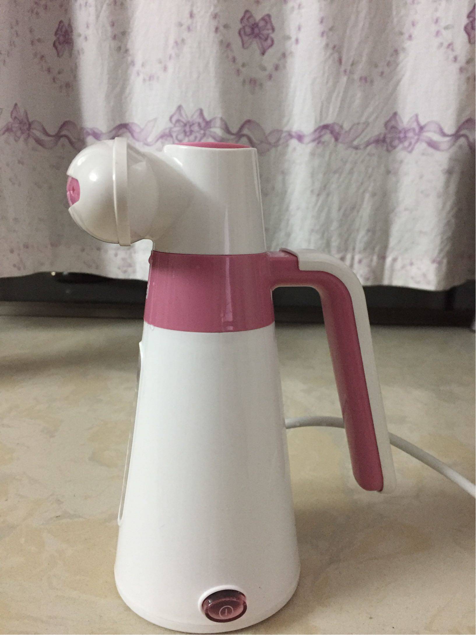一个粉白色一看就很适合女生的外观,塑料全塑料的质地,看起来还不错,把手白色跟粉色主机的地方有一点松,认真讲全塑料的不太了解塑料这种具体的质量问题但是还是有一点点担心水太烫会不会有什么影响。
