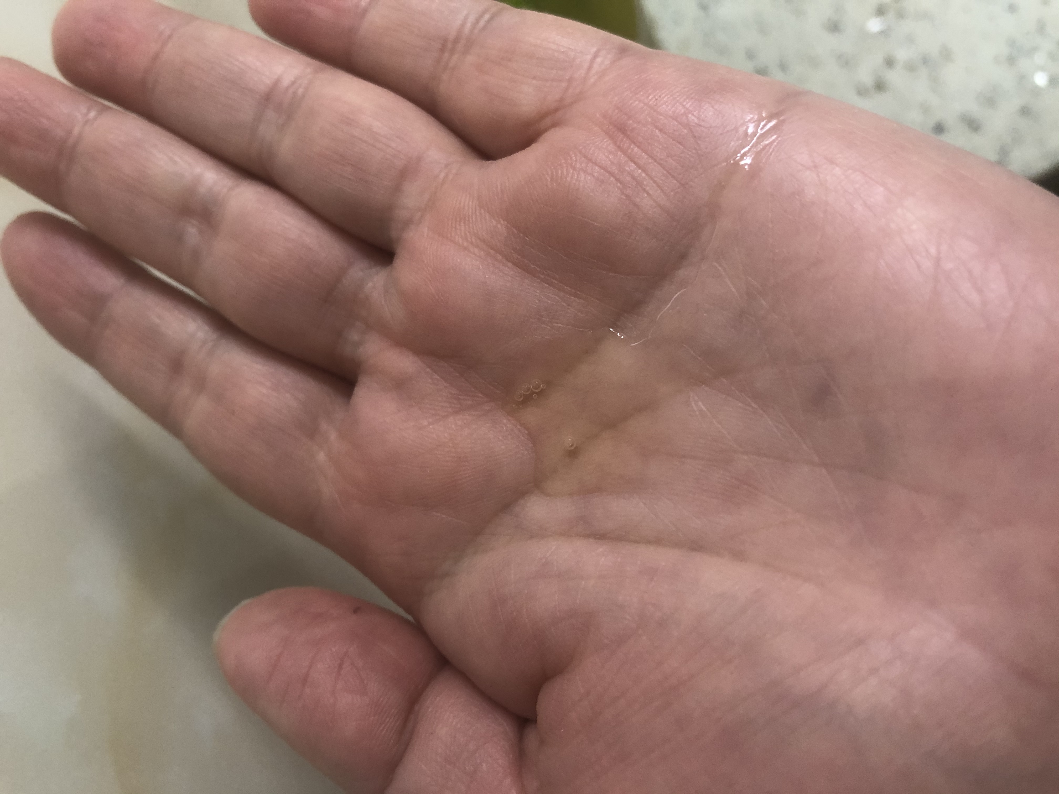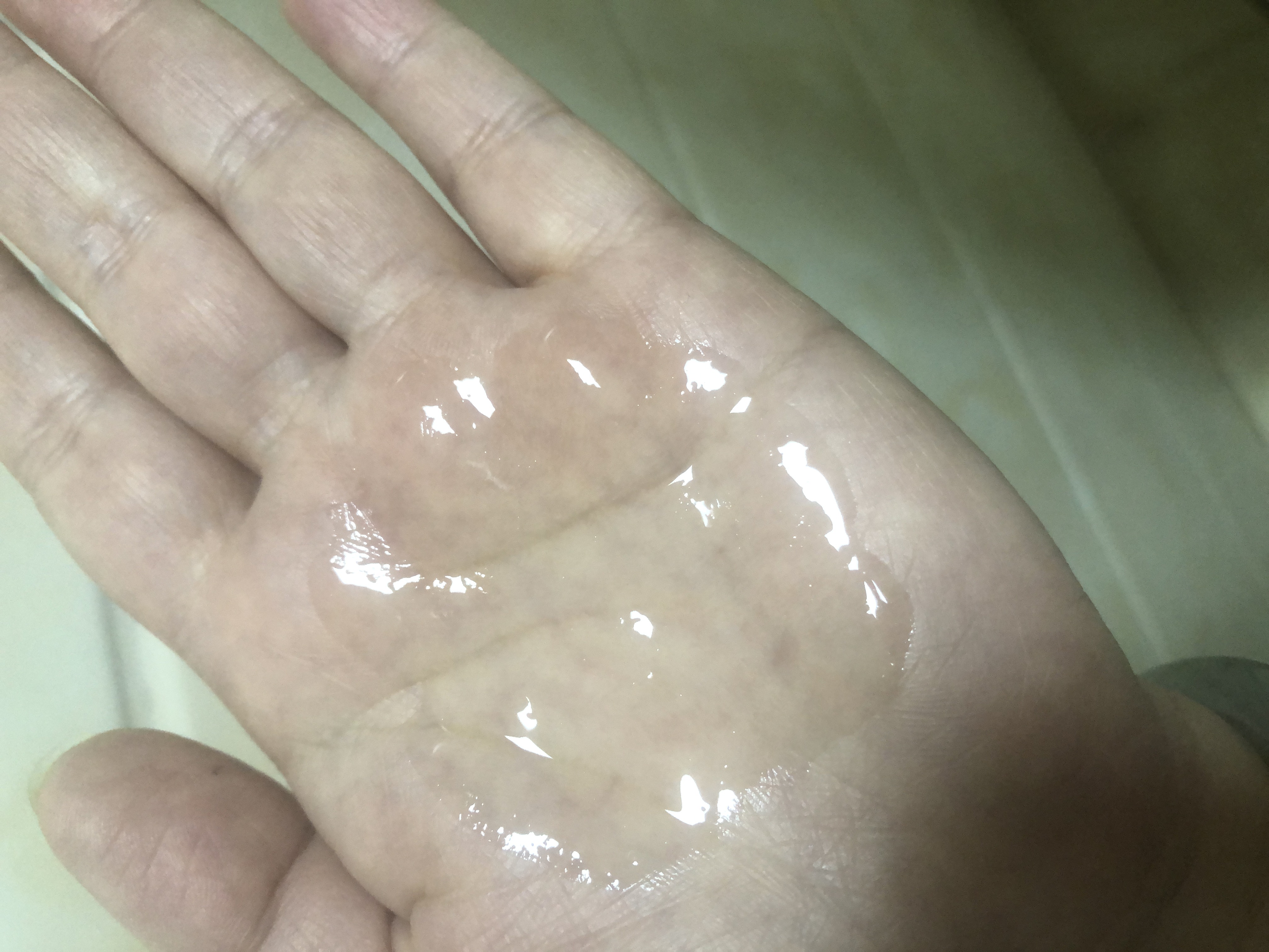将瓶内液体挤出到手心,可以看到卸妆液是透明?喱状的,浅浅的茶色,带有很轻微的淡淡香味。(因为是在浴室拍的照片,光线效果不是很好。)