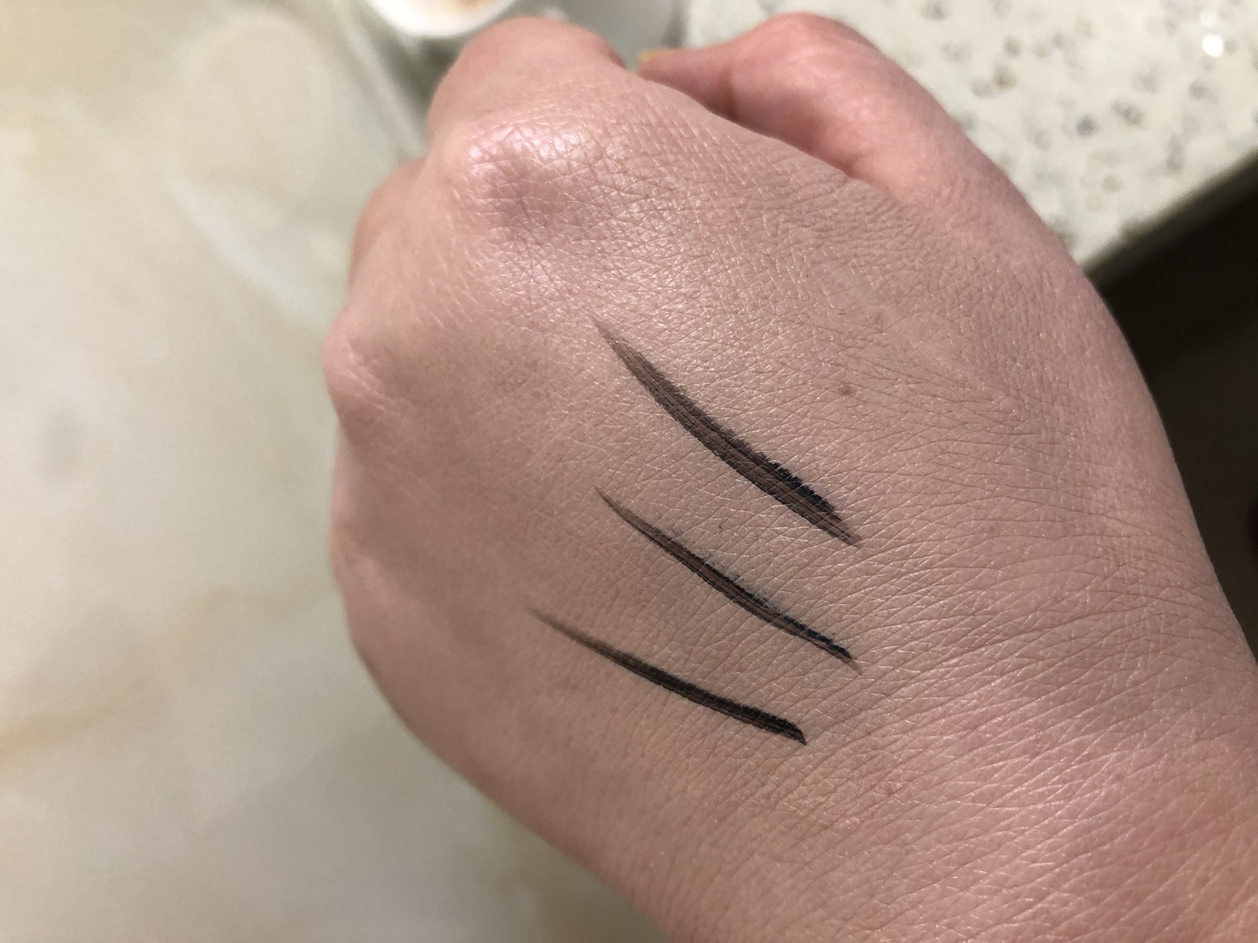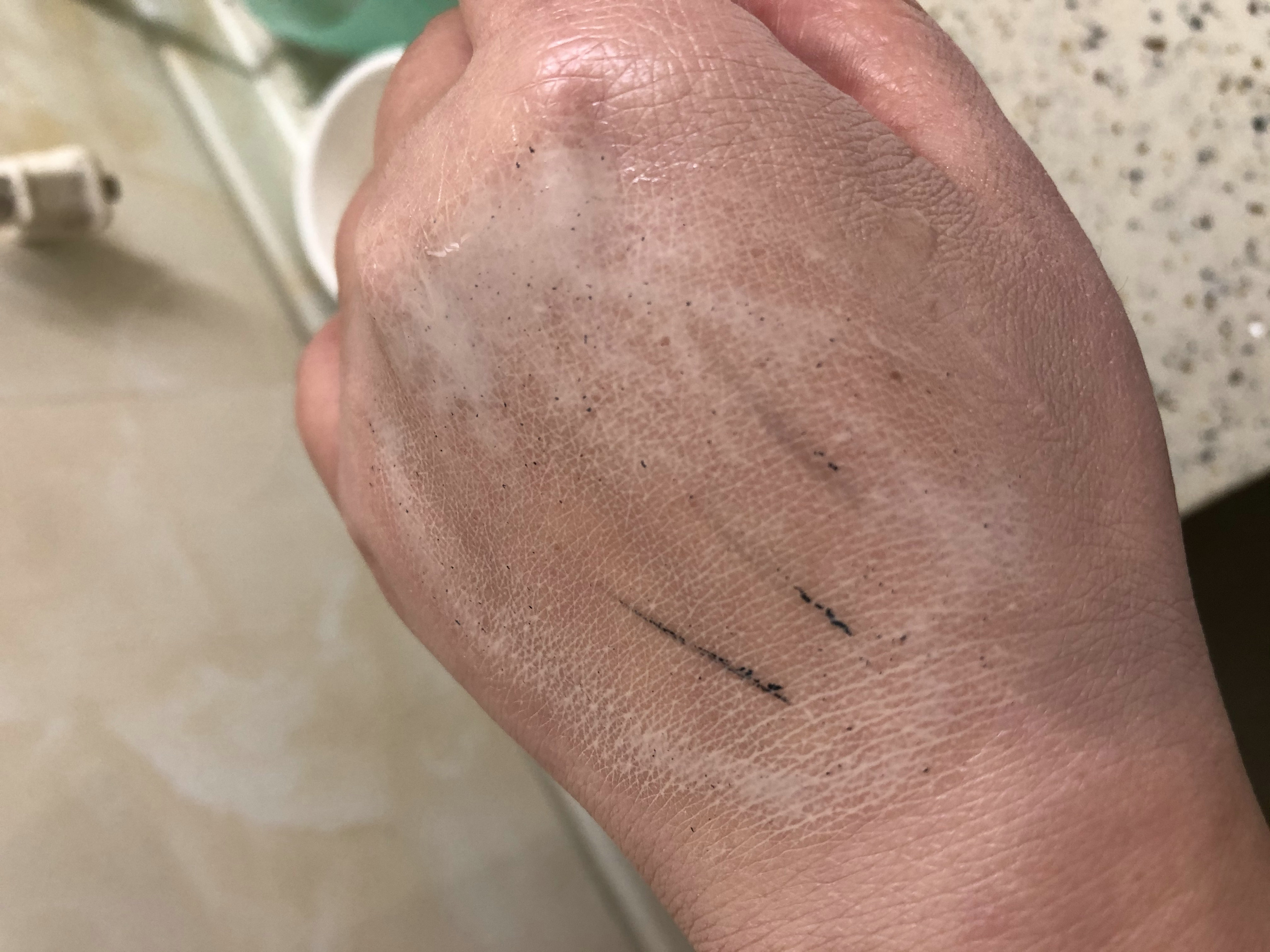 为了考验该产品的卸妆能力,我在手上涂抹了粉底霜、打了一层遮瑕膏,然后描了防水的眼线液。