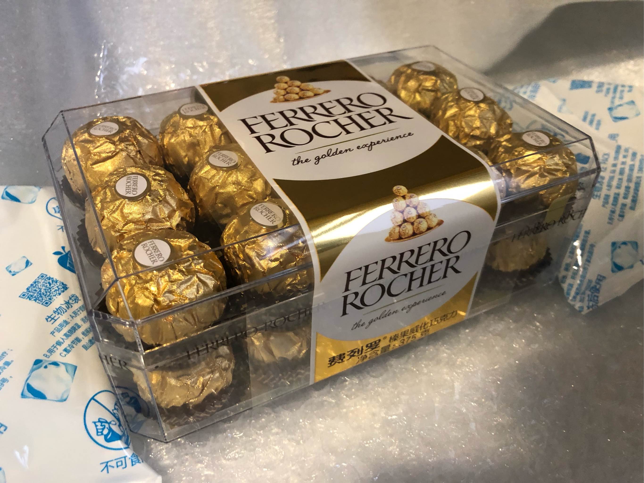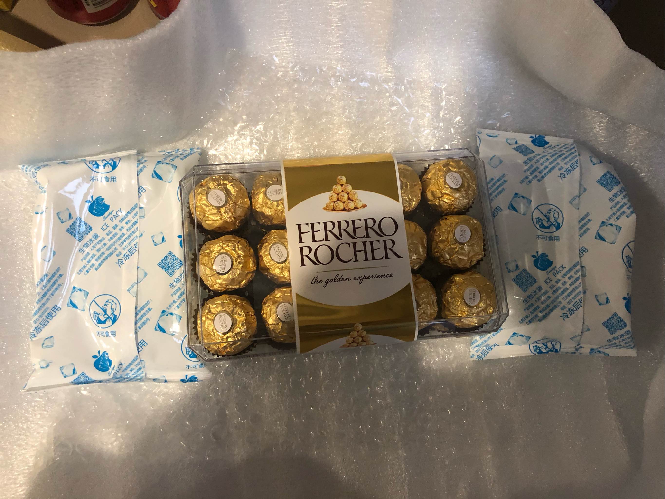 包装真的很细致 有礼品袋 送人比较好看。 加厚保温膜 还有配有冰袋 以防巧克力融化 细节很到位 巧克力完好无损 依旧最爱费列罗 ~ 满口的醇香 吃一颗就会很开心 哈哈
