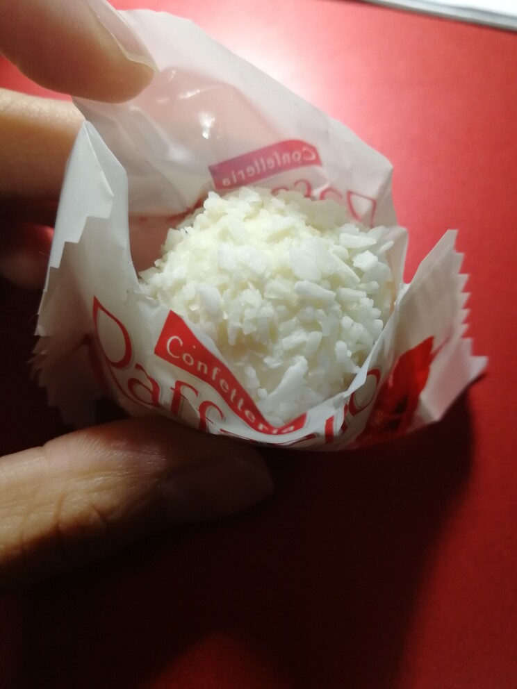 表面均匀附着了椰蓉 比较好的中和白巧克力的甜腻 吃起来清爽一些 也比黑巧克力费列罗的花生碎更细腻柔和
