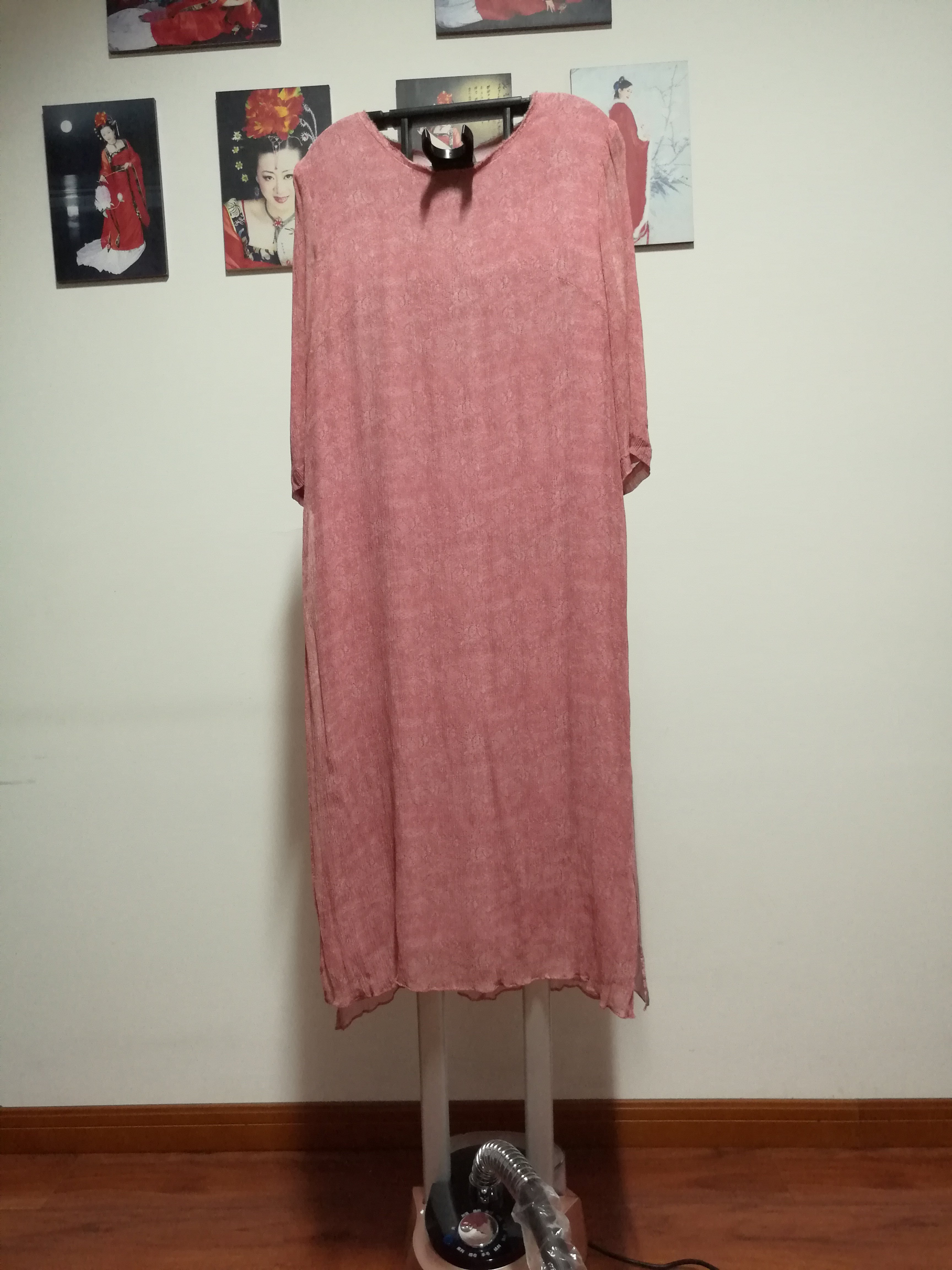上图是真丝连衣裙的里料内衬,面料是真丝的,这张是真丝连衣裙的外料是桑蚕丝的,熨烫后是不是很平整、飘逸、丝滑啊,丝绸面料最娇气,温度过高过低都不行,对熨烫要求很高,而这款挂烫机我4分钟就搞定了。