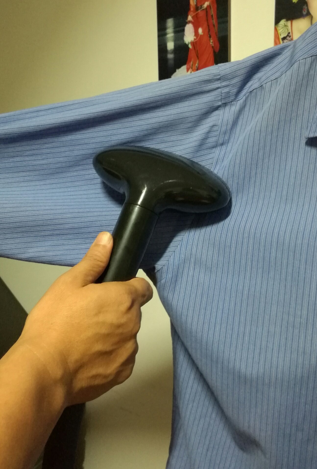 这是熨烫的第二件――衬衫,烫到衣服袖子的时候要稍微用力把袖子拉直,蒸汽喷头压在袖子折连的时光也要长一点,来回压烫,在烫衣领时,一般要把领子翻过去,从背面进行熨烫,这样比较容易。