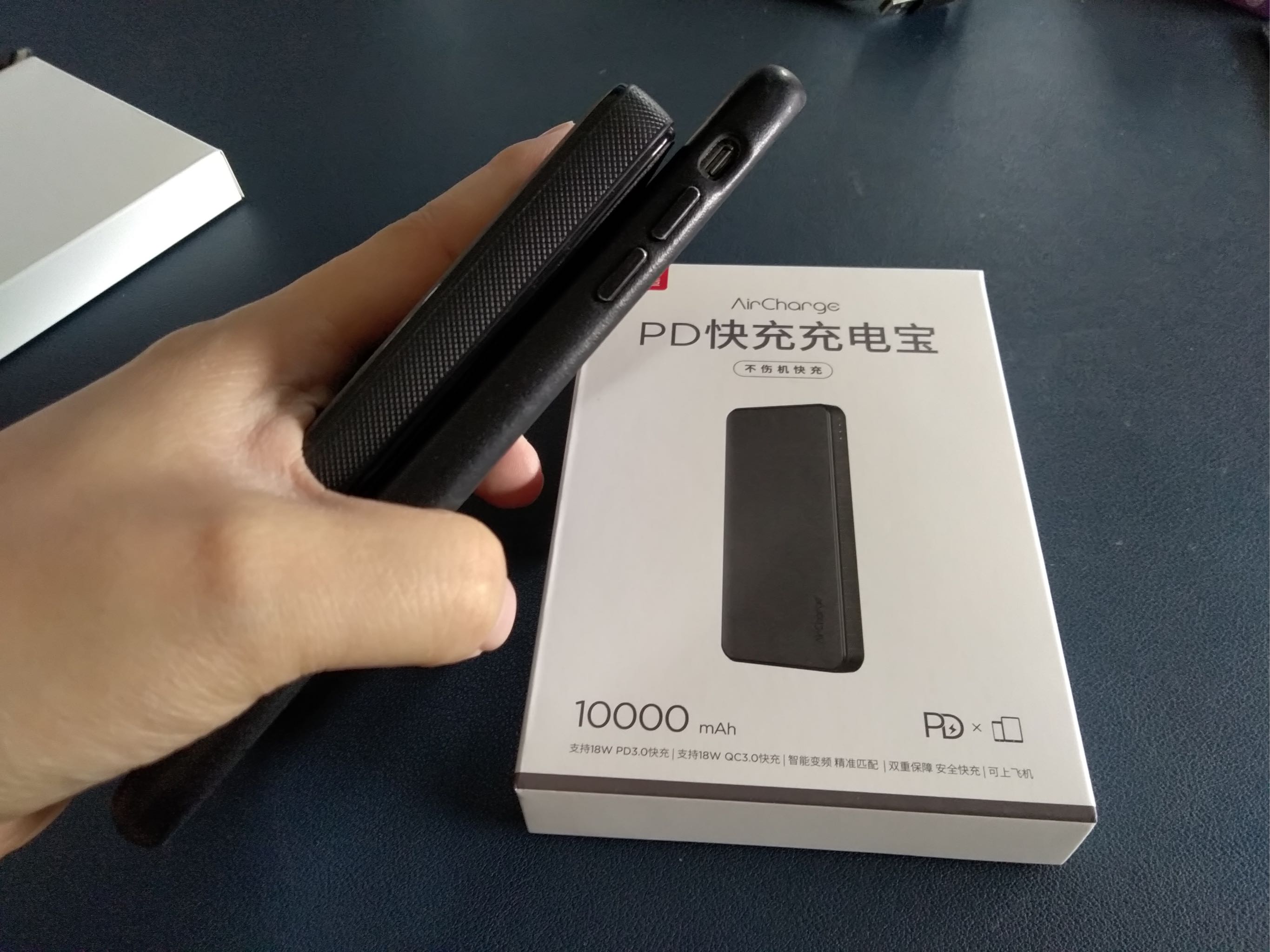 充电宝的尺寸比iPhonexs max小一点,单手握持充电宝加手机的情况下不会显得非常难掌握。