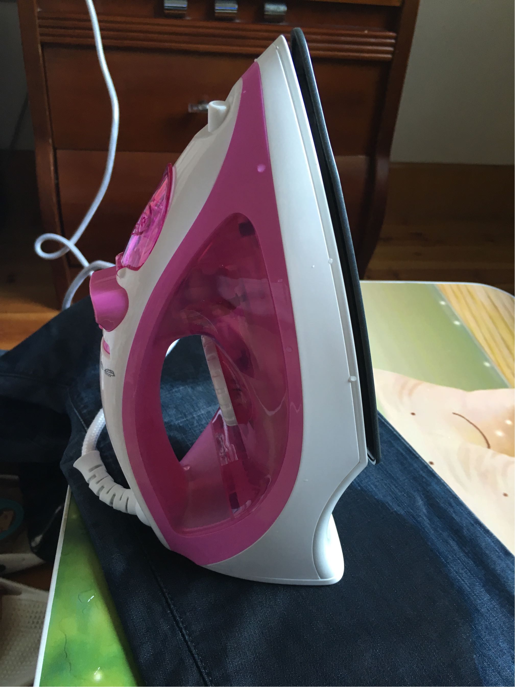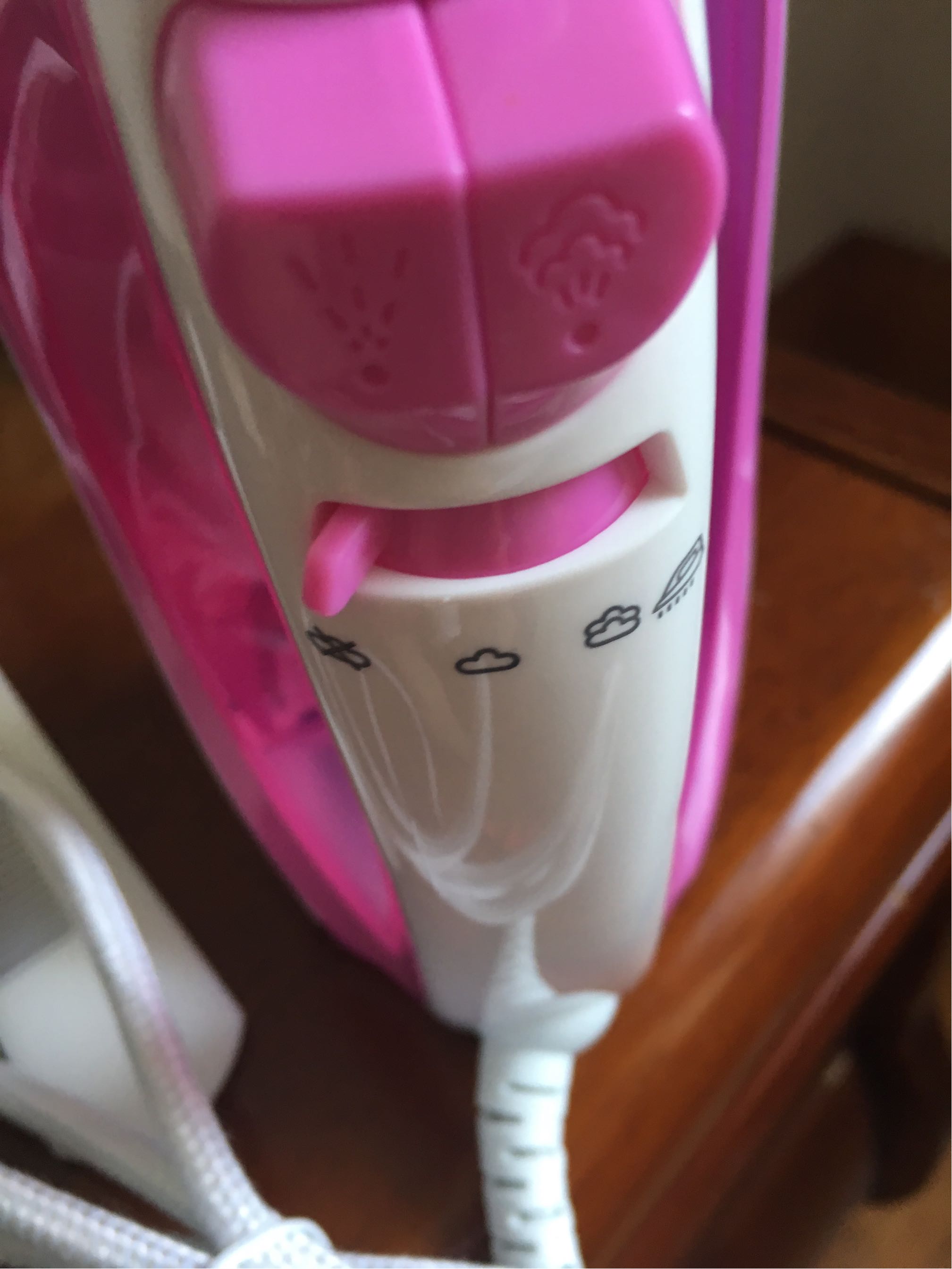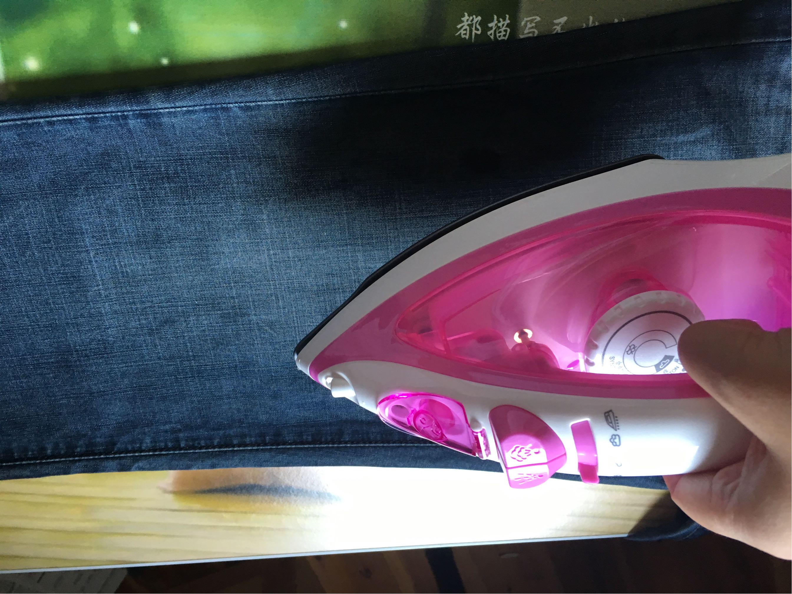 小亮点熄灭了就可以开始熨衣服了,上面有两个按钮,分别是喷水的和滴水的。滴水的有点不好用。