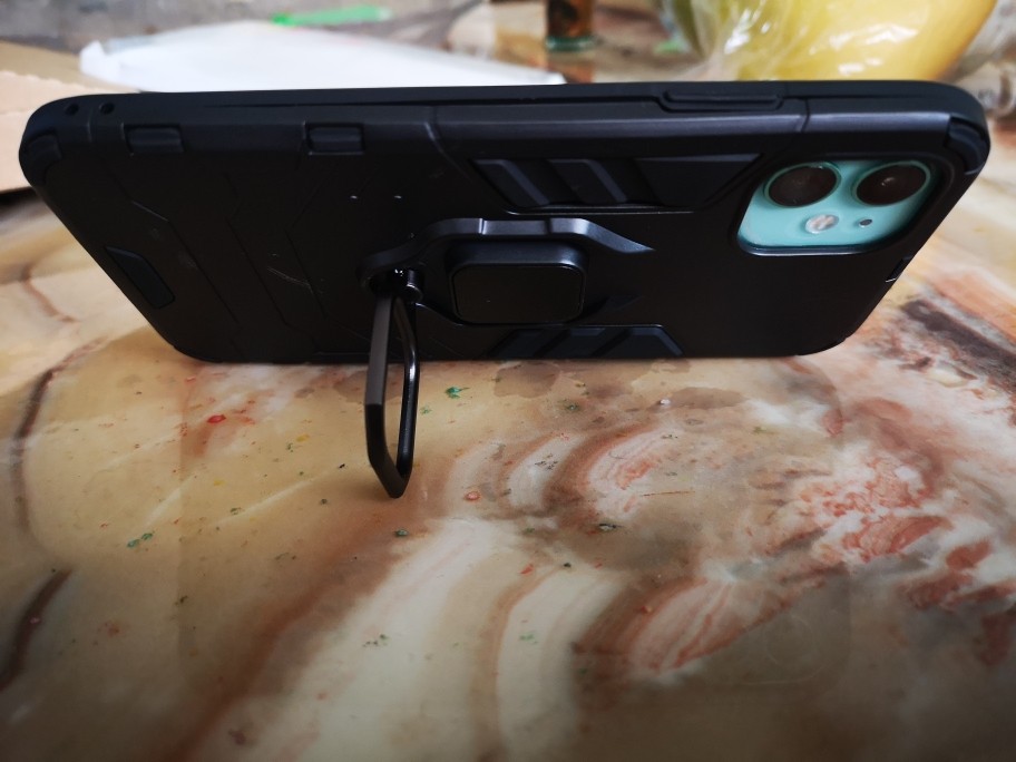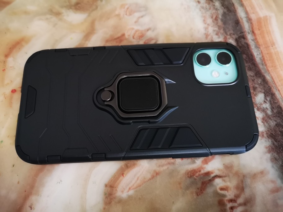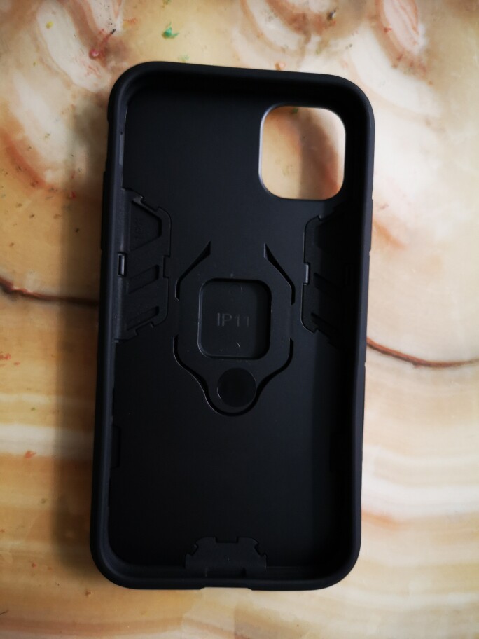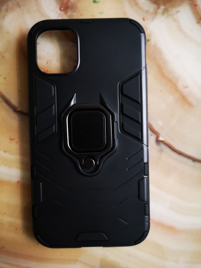 黑色的保护套整体感觉很酷,感觉可以起到保护作用。背面还有指环扣,可以支撑手机,看电视,也可以拿在手上,手机不会掉地上。包围手机中框的材料很柔软,可以很好的保护手机,不会磨花手机。