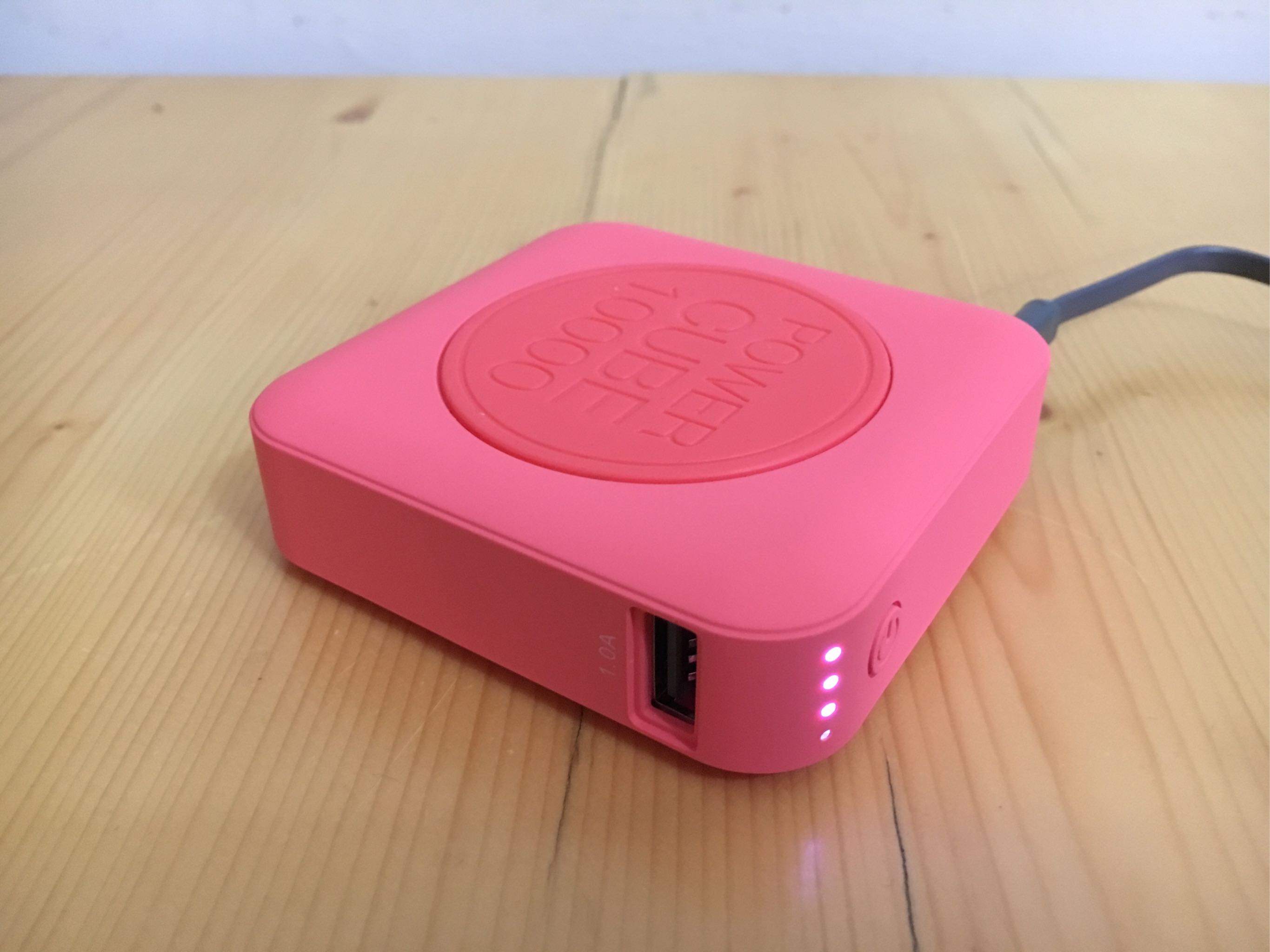 整体造型一般,但西瓜红色比较特别,马上天冷了,光是看着就很有温度。摸上去是丝丝滑滑的触感,材质应该是硅胶,虽然没有金属材质的有质感,但是也不用担心会因为不小心的掉落而完成掉漆、变形等问题。性能上整体比较良好,10000毫安大容量、双USB 充电接口、电量指示灯等都比较人性化,使用方便。