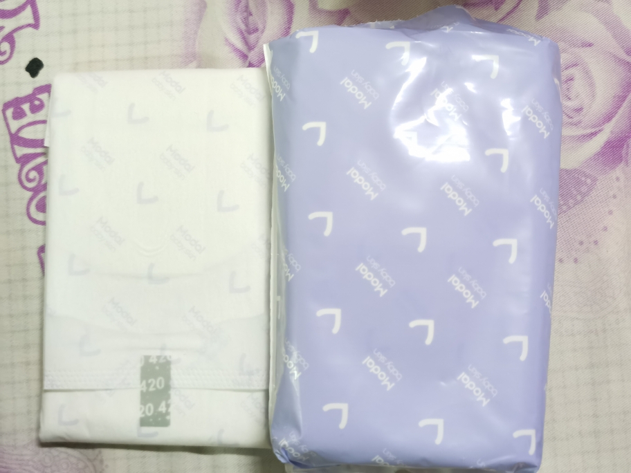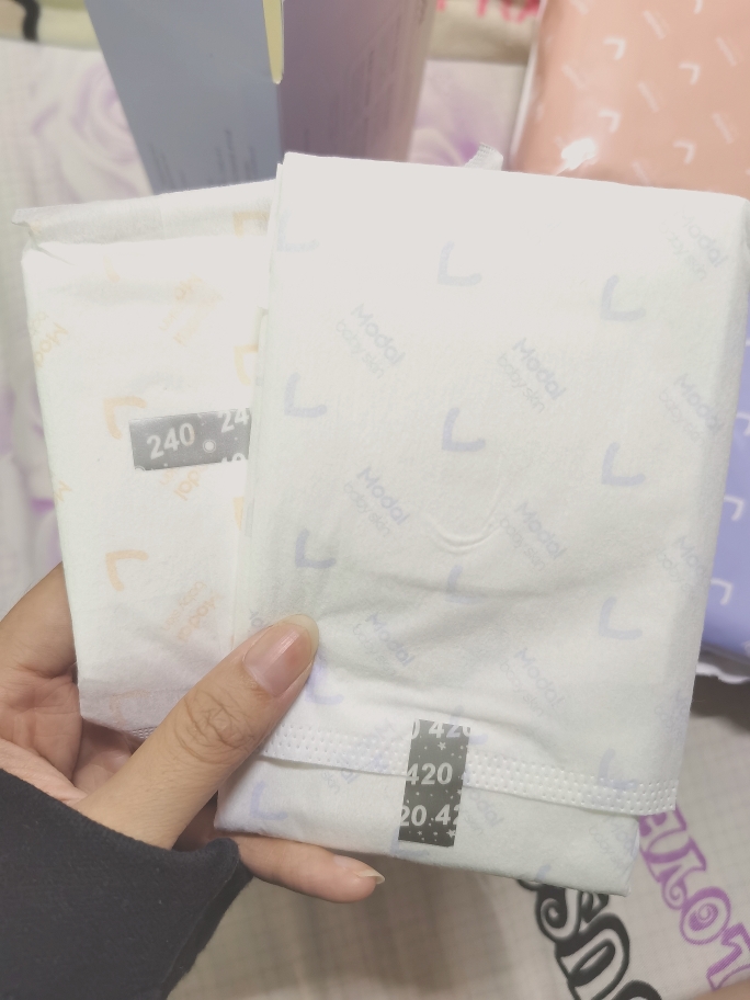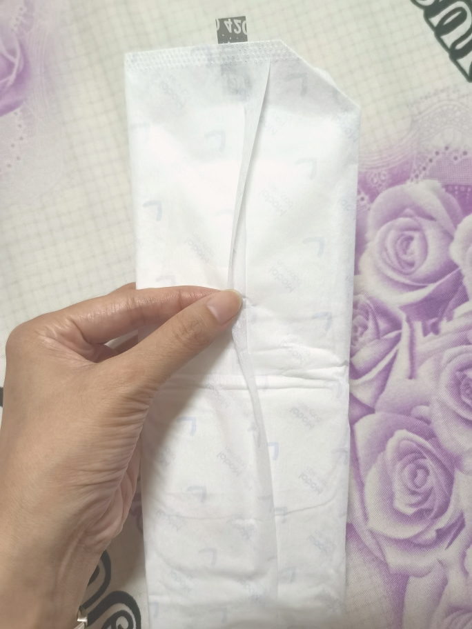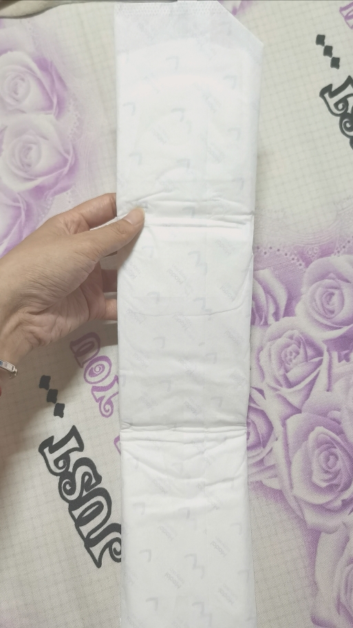 夜用的是420mm,很长,其实我感觉睡觉根本用不了这么长的,太长了点对我来说没必要,338mm对我来说就够用了。这个不是那种超大扇尾的,相对于我平常用的夜用的扇尾窄了很多,不过因为很柔软,跟pp贴合度还比较高,按理说不容易侧漏