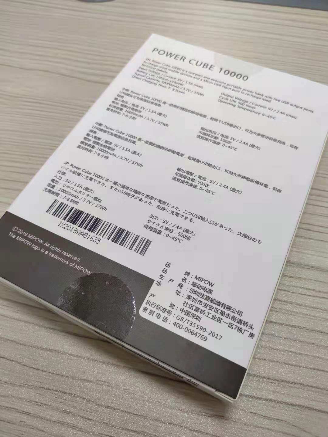 包装背面是各种文字的充电宝说明,包括输入输出功率等。