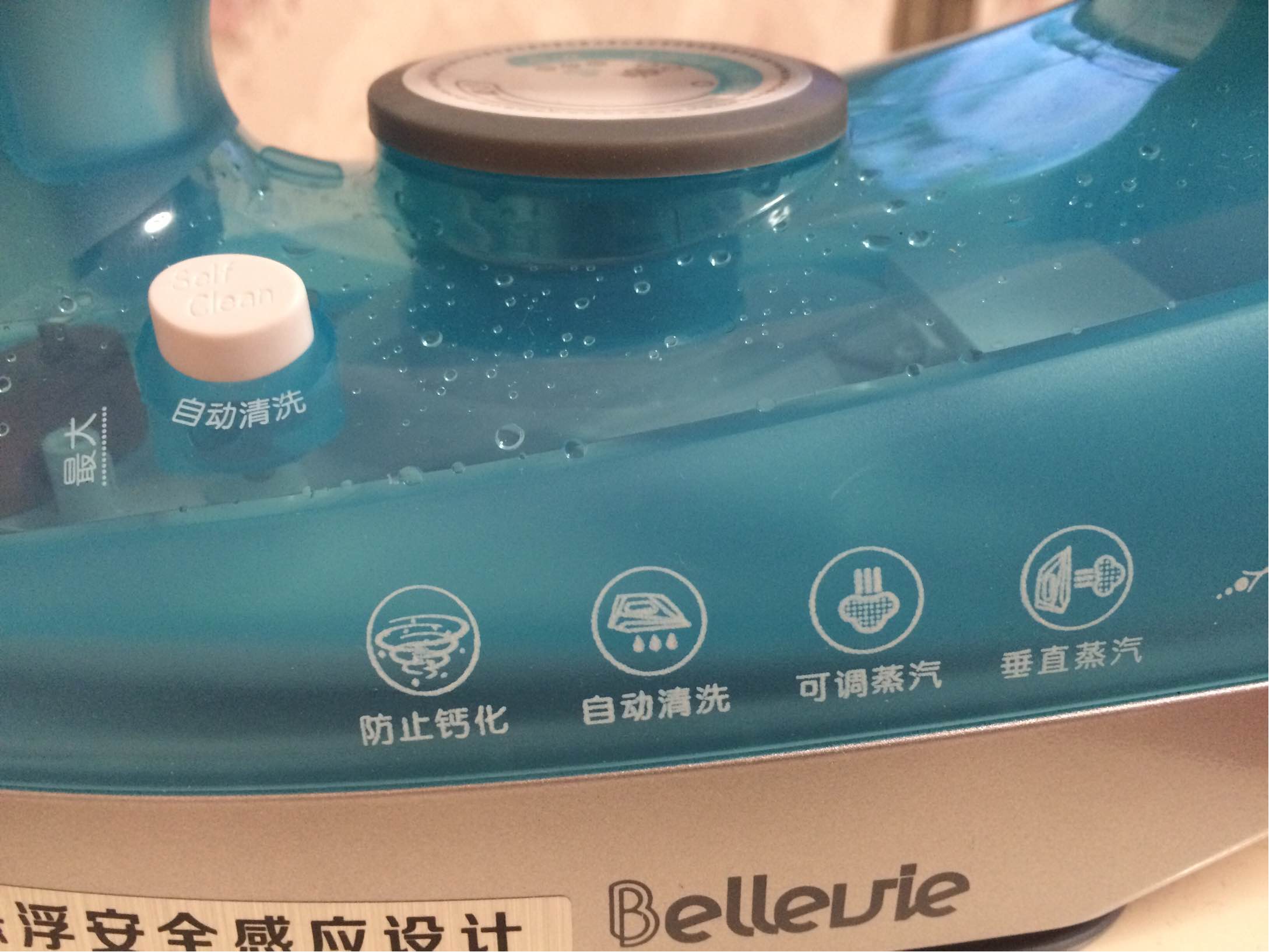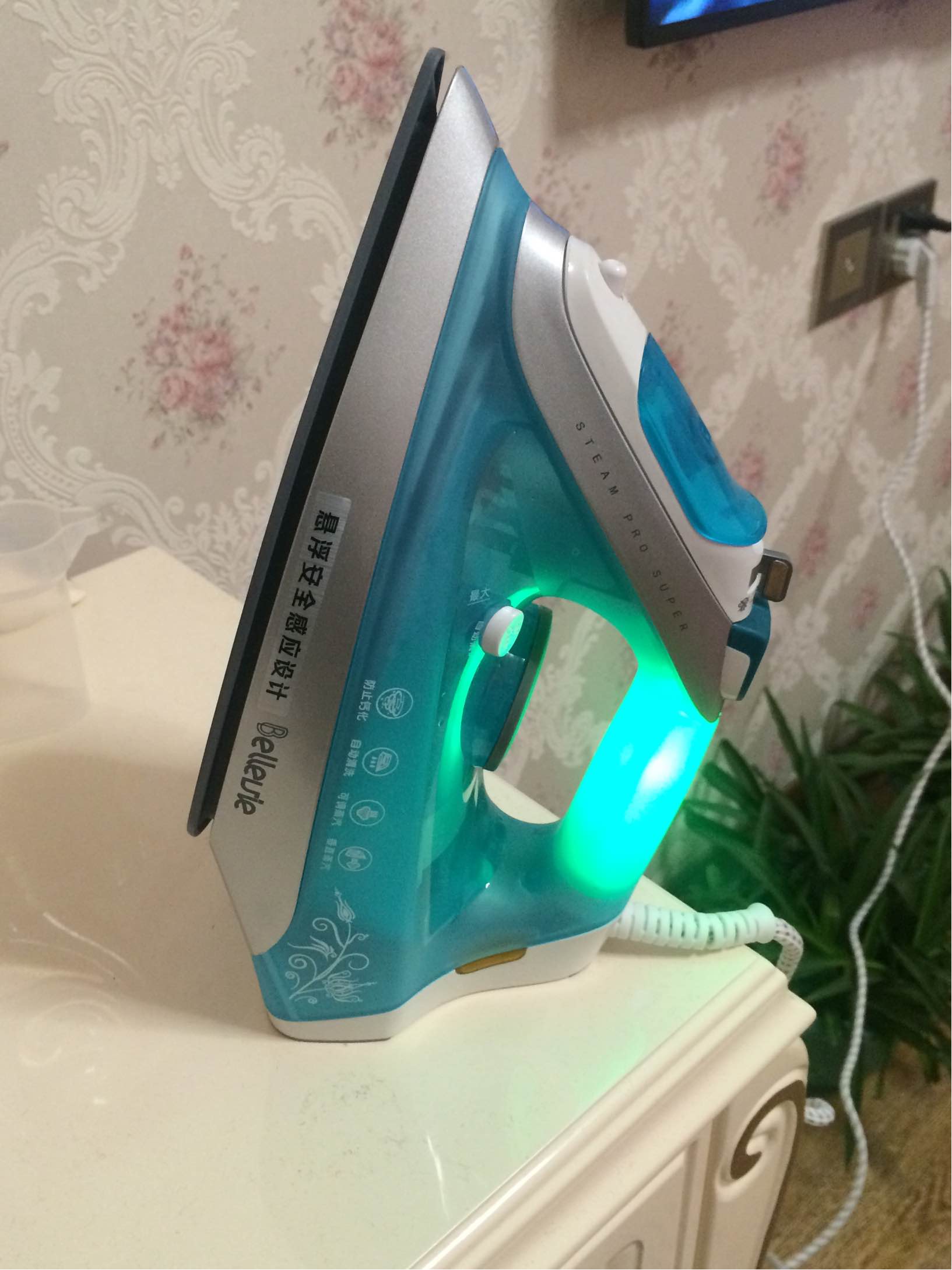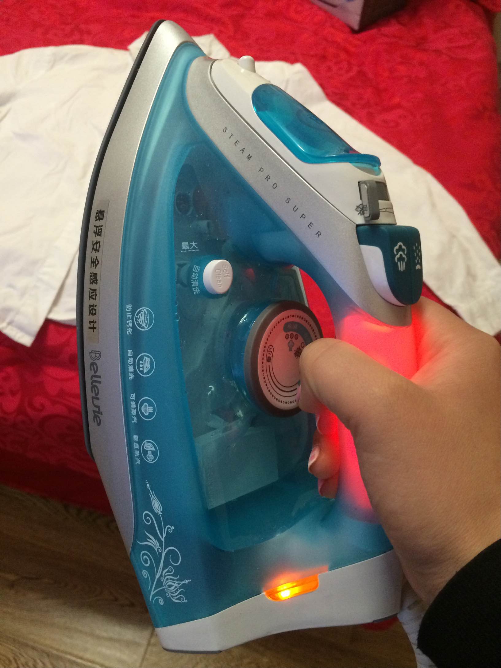 手持后变成红色的灯。当把机器平放熨衣服的时候才会出蒸汽,离开衣服立马停止工作,真的是太智能
