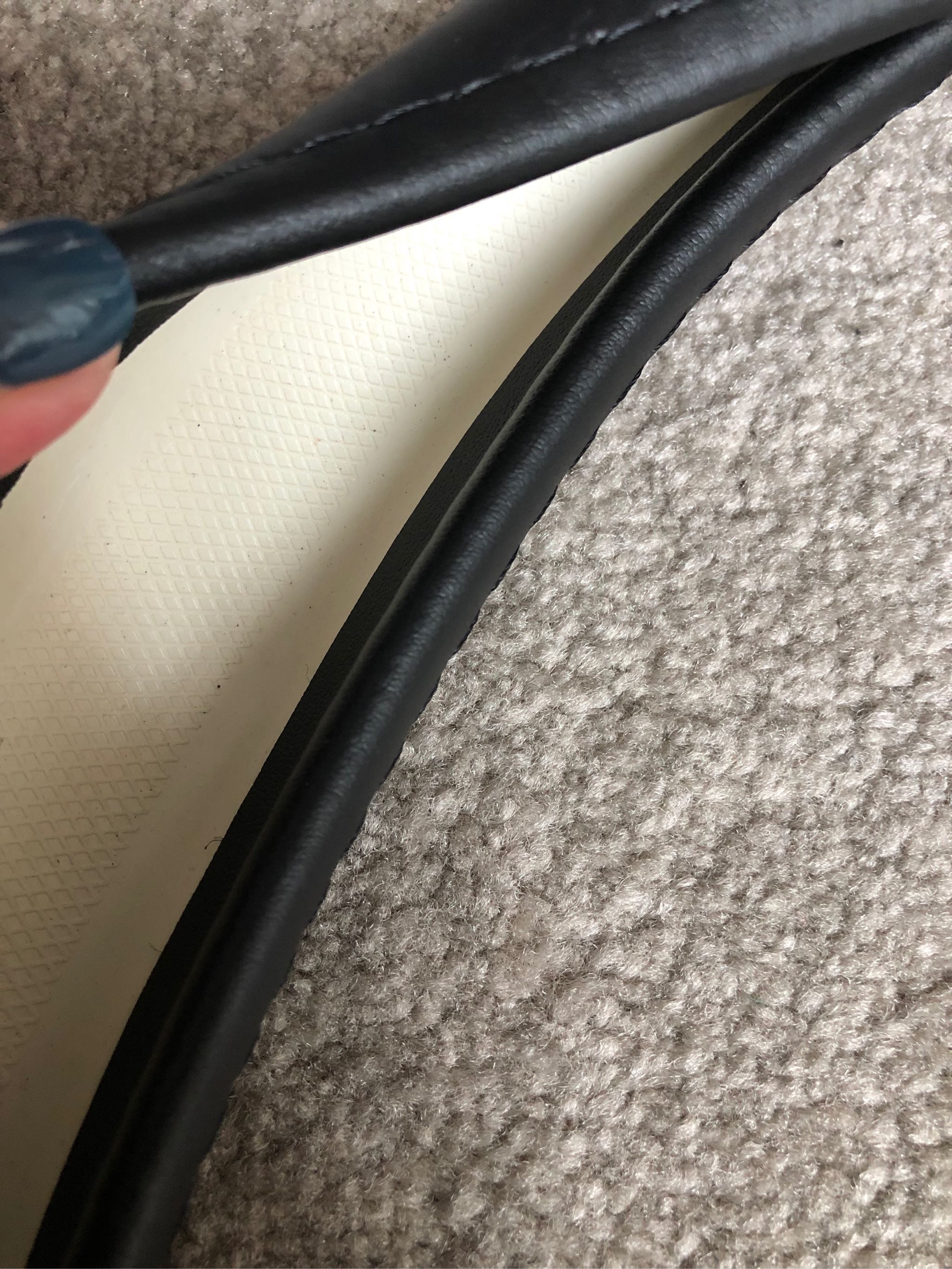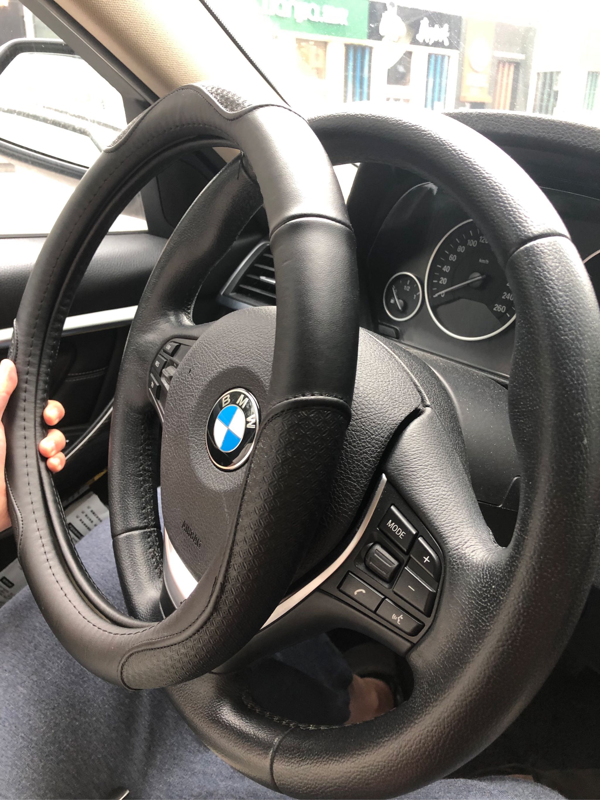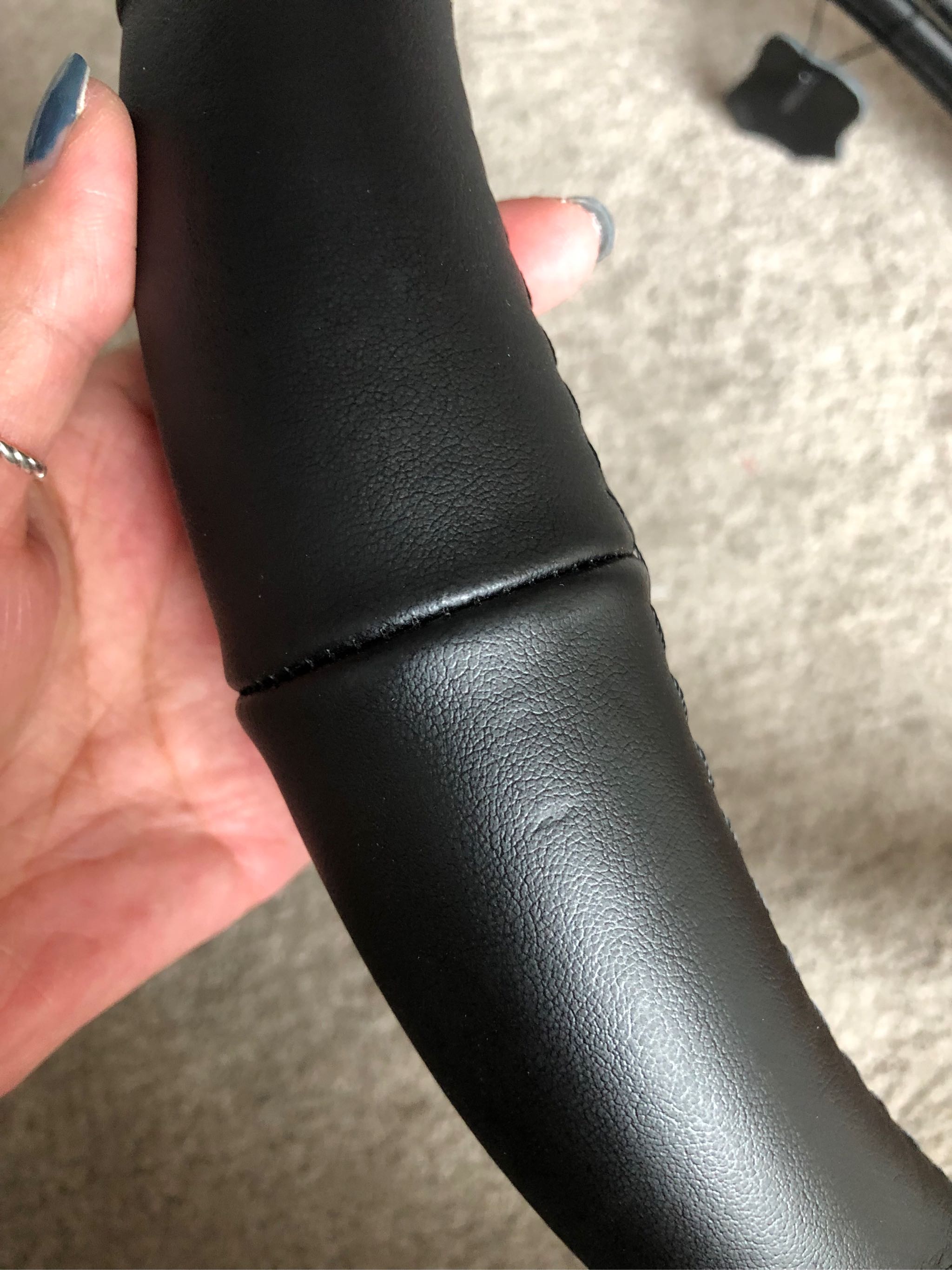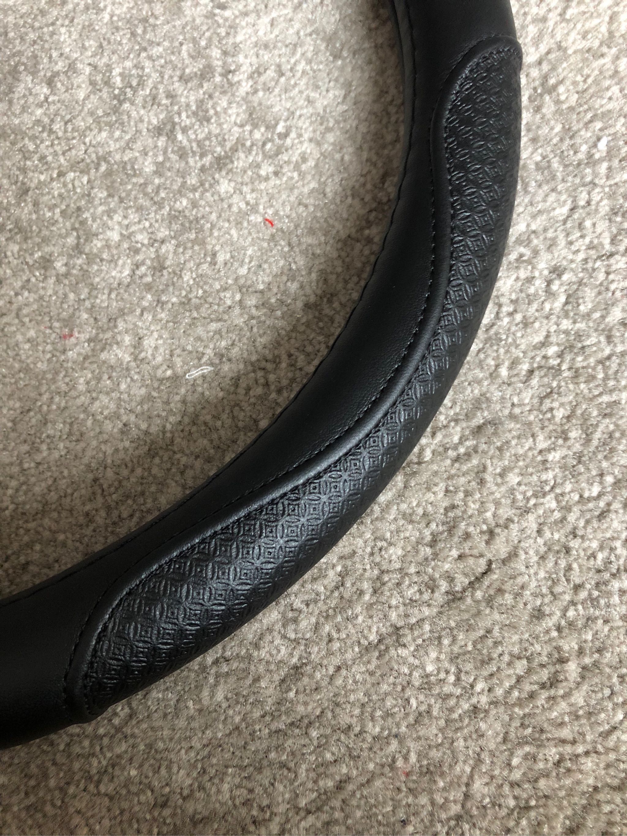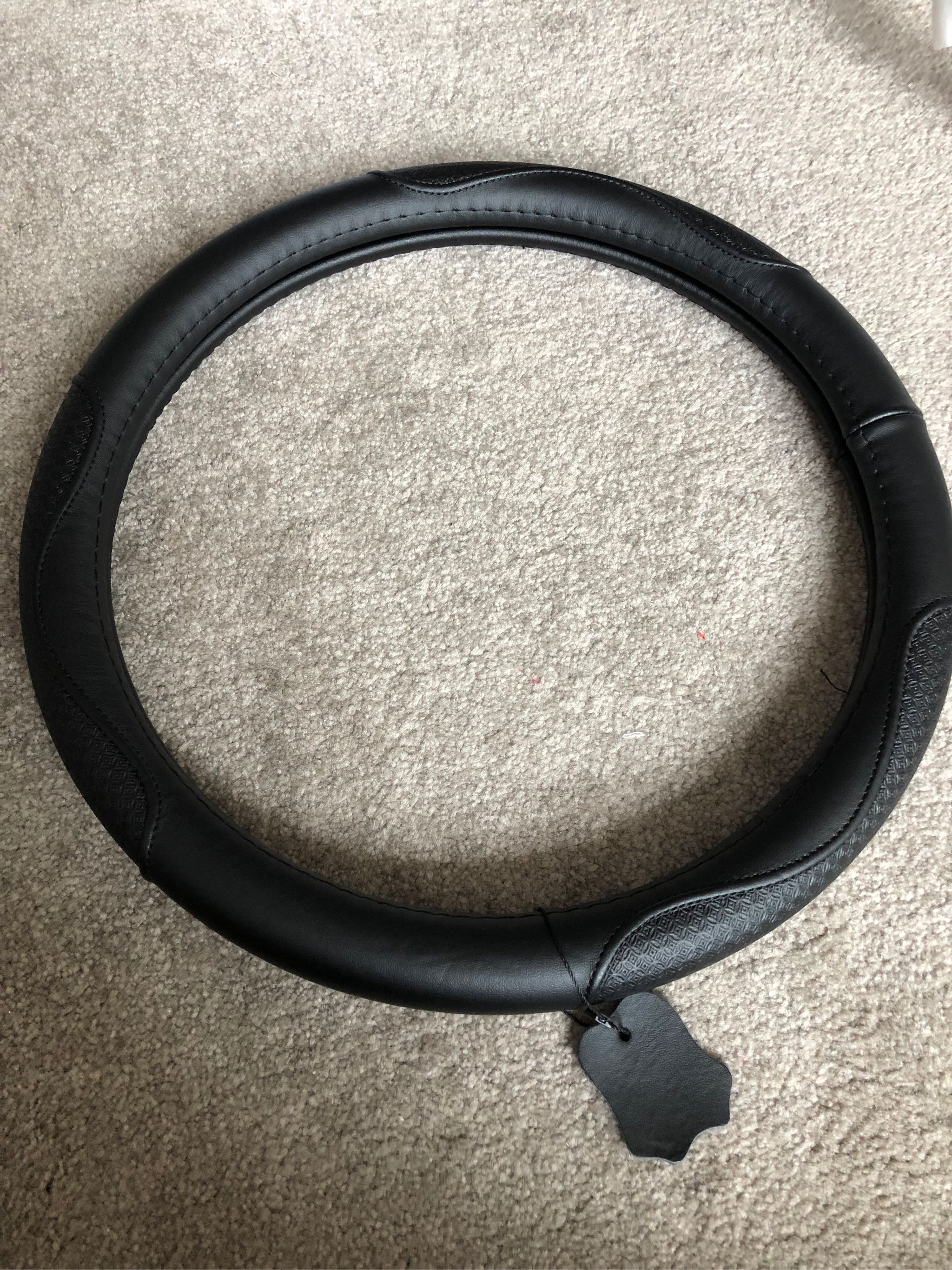 真真的牛皮,拿在手上比较有分量,弱女子安装会有点废力气,跟方向盘完美贴合,只是装的时候好像装倒了,哈哈哈