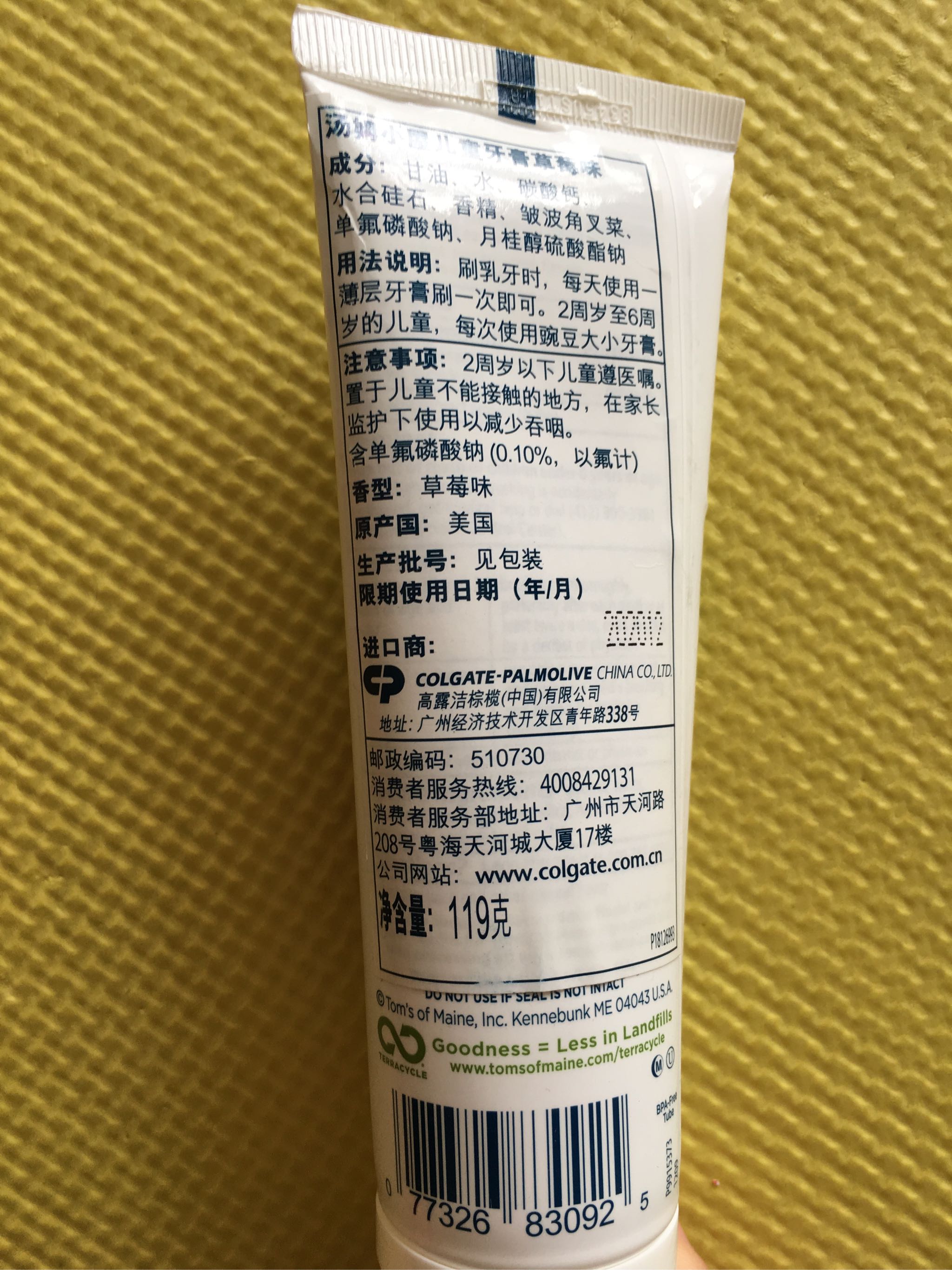 牙膏是草莓味的,小朋友最喜欢的味道,刷牙的时候很开心。牙膏成分标注很清楚,日期也新鲜。